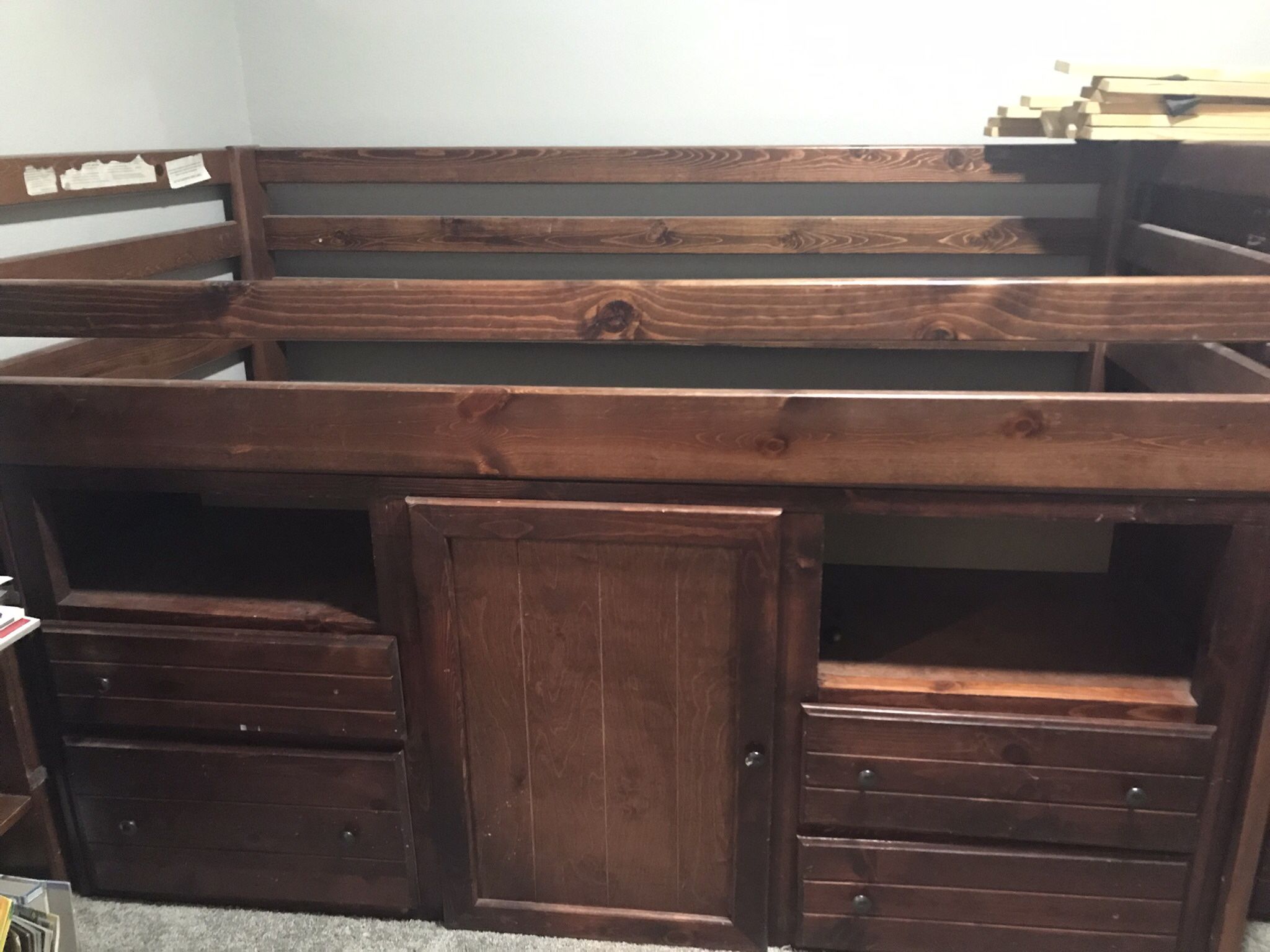Selling as is. No mattress. Please bring help to carry the lower drawers of the bed. Partially disassembled and ready to go. It is not new so it has some tear & wear. It’s firm once it’s set up.