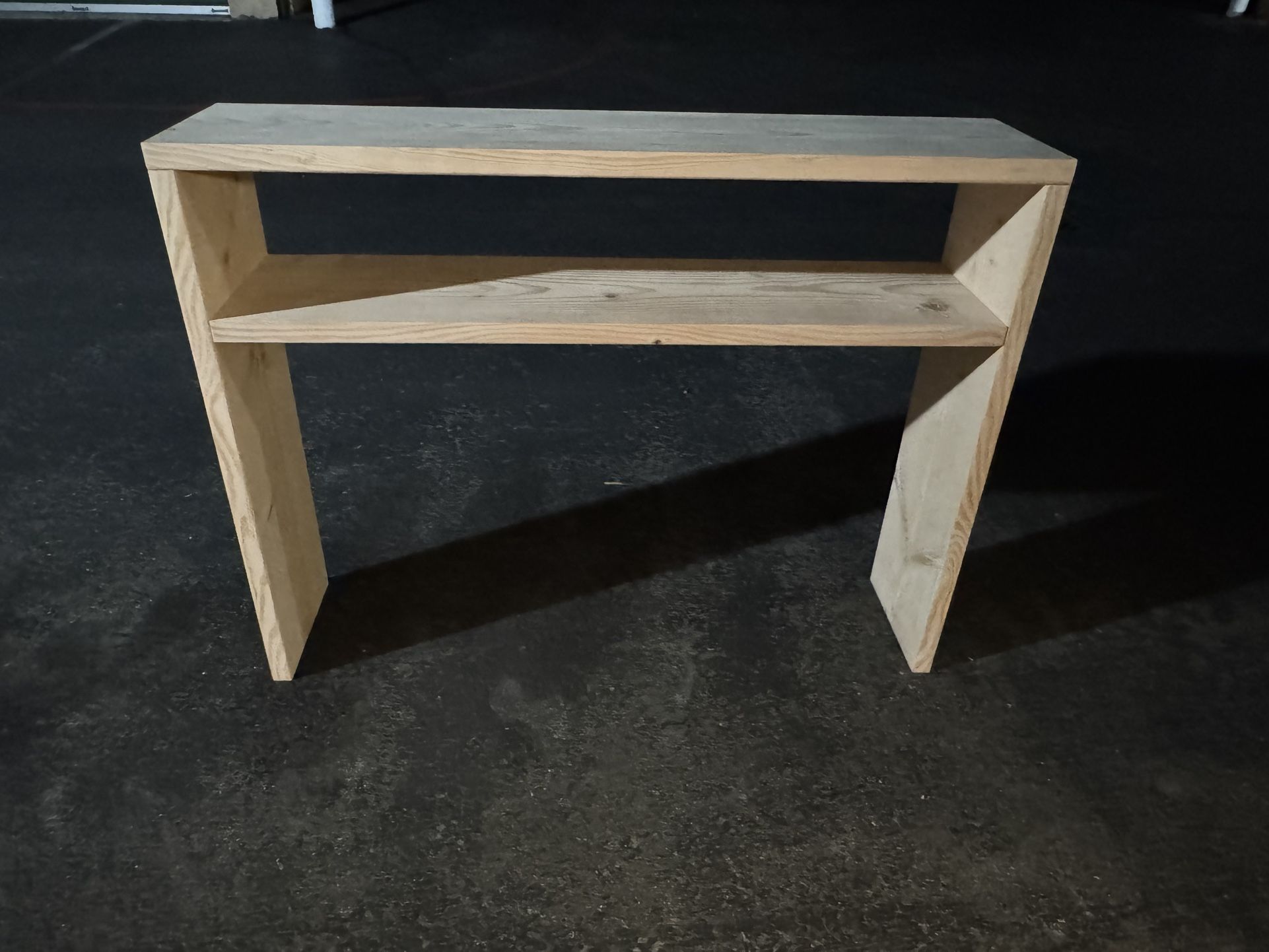 Sanded and unstained. Made with pine. Shelf has 8” clearance. L: 48” W: 11” H: 36”