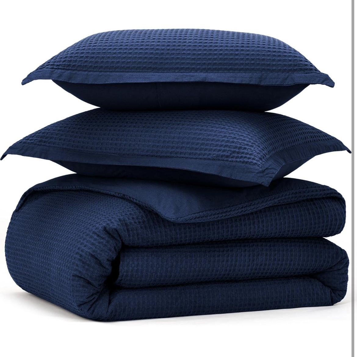 Bedsure Cotton Duvet Cover King - 100% Cotton Waffle Weave Navy Blue Duvet Cover King Size, GentleSoft™ and Breathable Bedding Set for All Season, 3 P