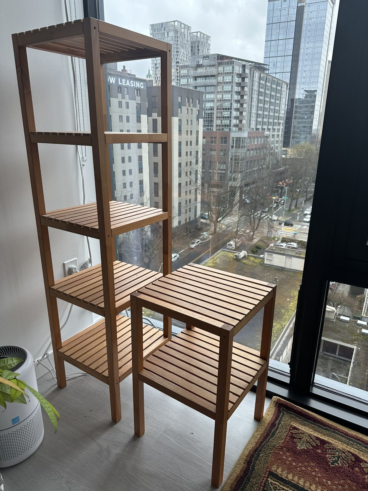 Both shelves for $25. Large Shelf: 55" x 15" x 15" Smaller Shelf: 23" x 15" x 15". Pick up in First Hill.