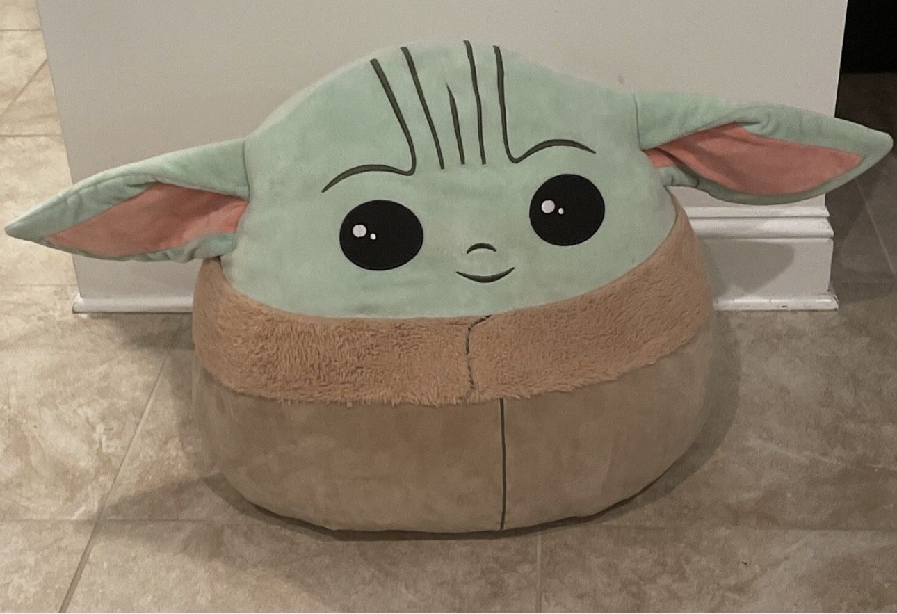 Adorable mint green character plush beanbag. Big black embroidered eyes and soft pink ear accents. Cozy tan/brown base with fuzzy collar. Fun kid-friendly seat. Cute nursery or playroom accent.