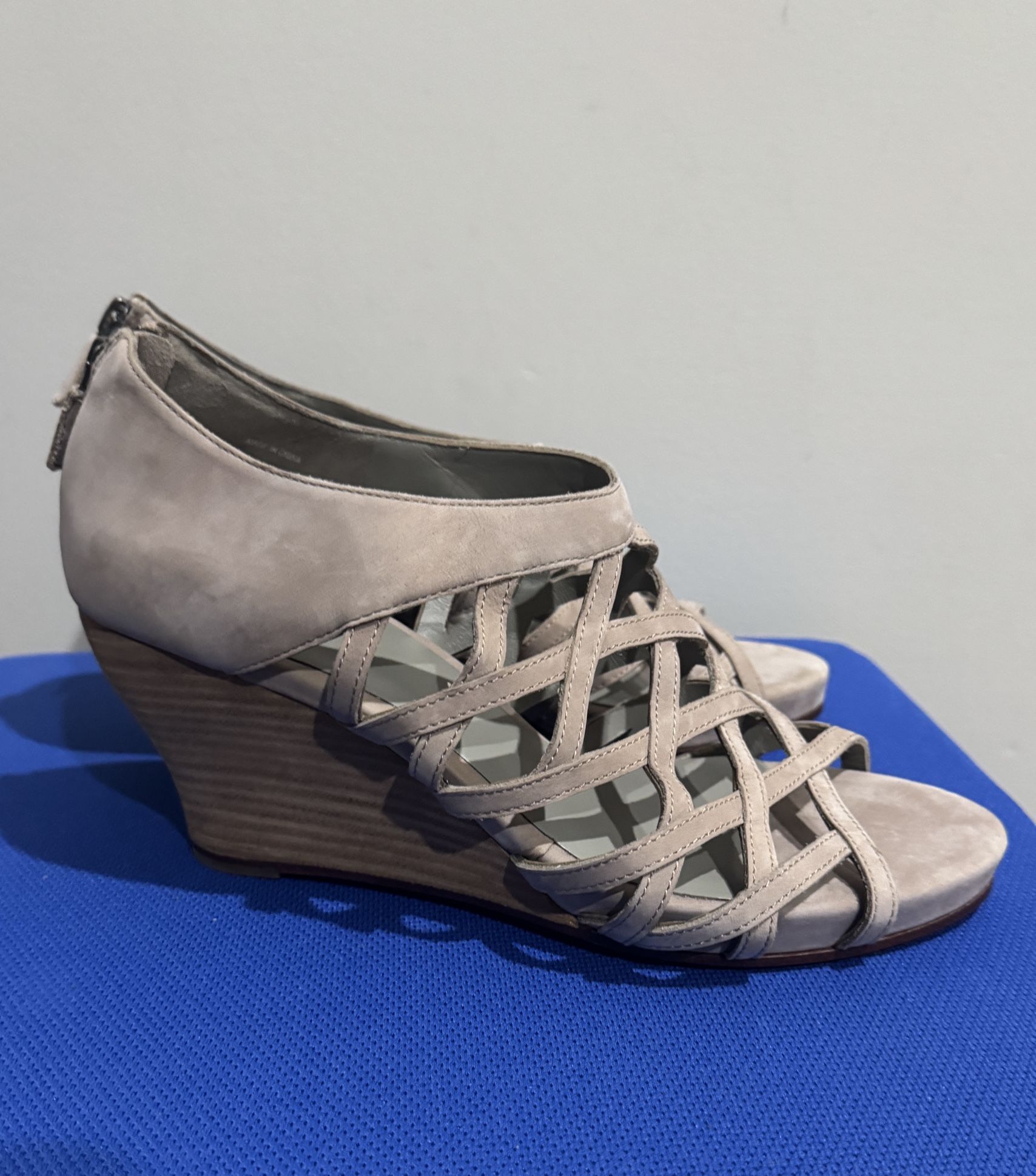 Eileen Fisher Zip Back Sandals; tan suede; New; size 9.5. Available at Consignment Connection, 2679-B Ramada Road, Burlington, NC; Ask for Vendor #10727. M-F 10-6; Sat 10-5; Sun 1-5.