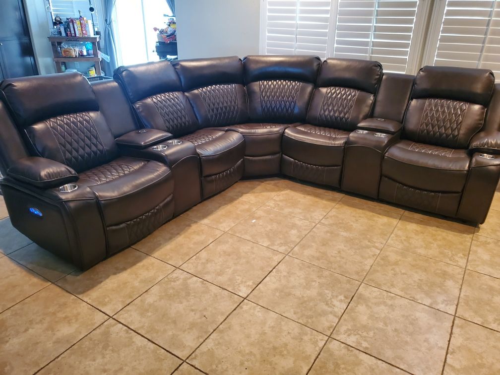Leather sectional Available in brown or grey 4 power recliners 4 power adjustable headrests 4 cup holders 2 wireless charging stations 2 storage consoles USB USB-c Store price $2400 FURNITURE , BOSS Price $1499 Please check out all my offers Everything Comes Brand New Delivery Available Ready to buy? Contact me direct 951-251-2983 Follow my Instagram @Furniture.Boss Thanks for reading my ad