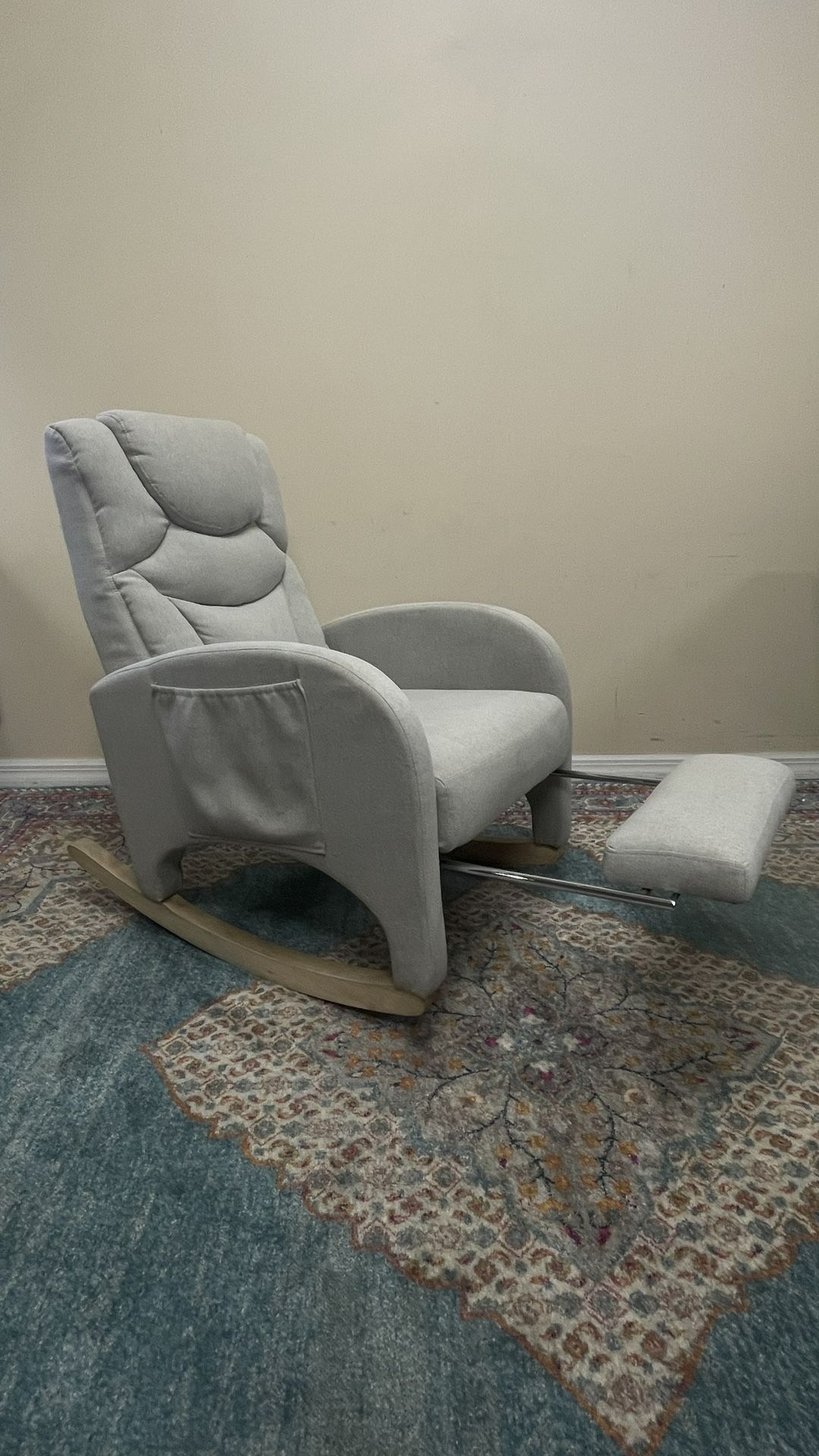 Nursery Rocking Chair Cotton Linen Fabric Adjustable Footrest. Smoke-free.