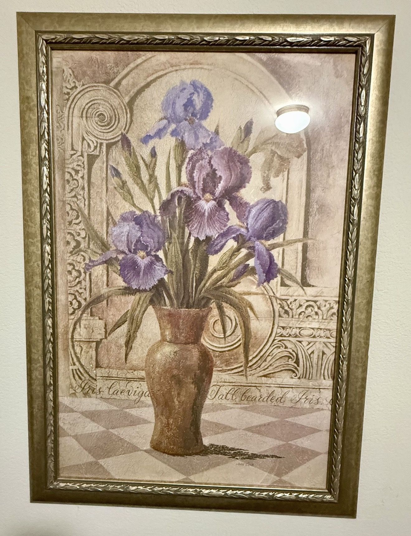 Commanding piece of wall art featuring a classic Iris botanical design (Iris laevigata, Tall Bearded Iris). This print is set in a very large, heavy gold-tone ornate wood frame from a Designer Series, signed by Joan Cole. Key Features: • Massive Size: 41 inches long by 29 inches wide—a true statement piece. • Designer Frame: Ornate gold finish suitable for Traditional, Tuscan, or French Country decor. • Vintage Character: NOTE: The frame has some cosmetic nicks and scuffs on the edges (see detail photo) due to normal wear and tear and moving. This adds to its antique, "vintage patina" look. • Ready to Hang: Glass is intact and artwork is clean. Perfect for: Above a console table, in a formal dining room, or as a high-impact piece in a large living room. *Local Pick up only, no shipping*