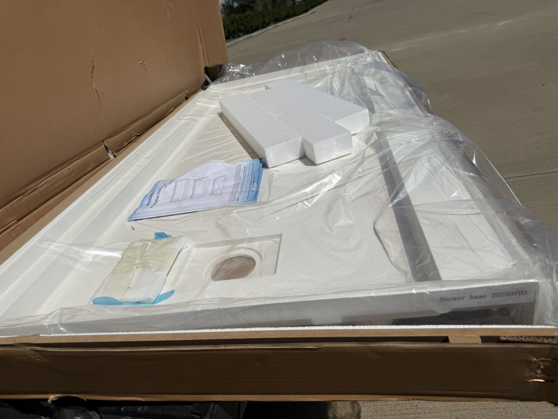 Please READ WOODBRIDGE 60" X 30" Solid Surface Shower Base In White With Left Drain,Single Threshold,Slip-Resistant Shower Pan For Alcove Installation ONLY THING IS THAT IT HAS A MINOR DAMAGE AS SHOWN IN PICTURE. ✨ Por favor, LEA Plato de ducha Woodbridge de 152 x 76 cm (60" x 30") de superficie sólida, color blanco, con desagüe a la izquierda, umbral simple y superficie antideslizante, ideal para instalación en nicho. El único detalle es que presenta un pequeño desperfecto, como se muestra en la imagen.
