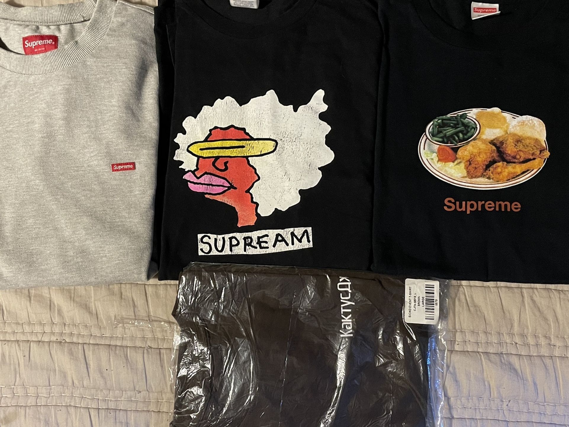 Used Supreme for sale. Gonz tee purposely distressed sz.L 8/10 $50 Supreme crew heather grey sz.M 9/10 $70 Dinner tee sz.L 9/10 $70 Travis Scott fortnite sz.L ds $80