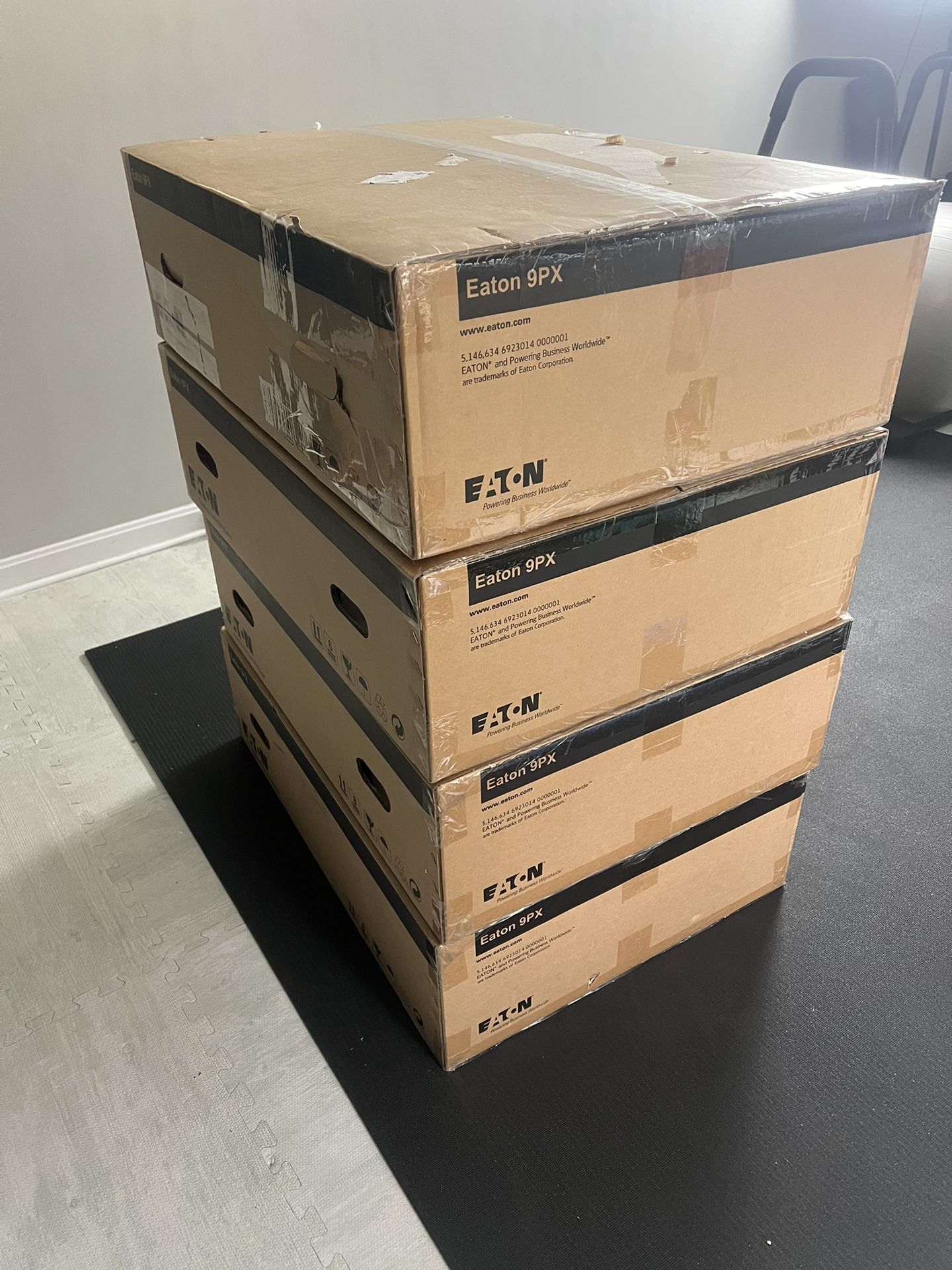 Brand New Equipment. Still in box of purchase. Two sets of Eaton 9PX [EBM 72V RT] and [3000GL RT]. Four units total. Looking to sell 1 set, both sets or two [9PXEBM72VRT] with one [3000GL RT]. Flexible to work with buyer’s needs. $1,000 for both sets OBO .