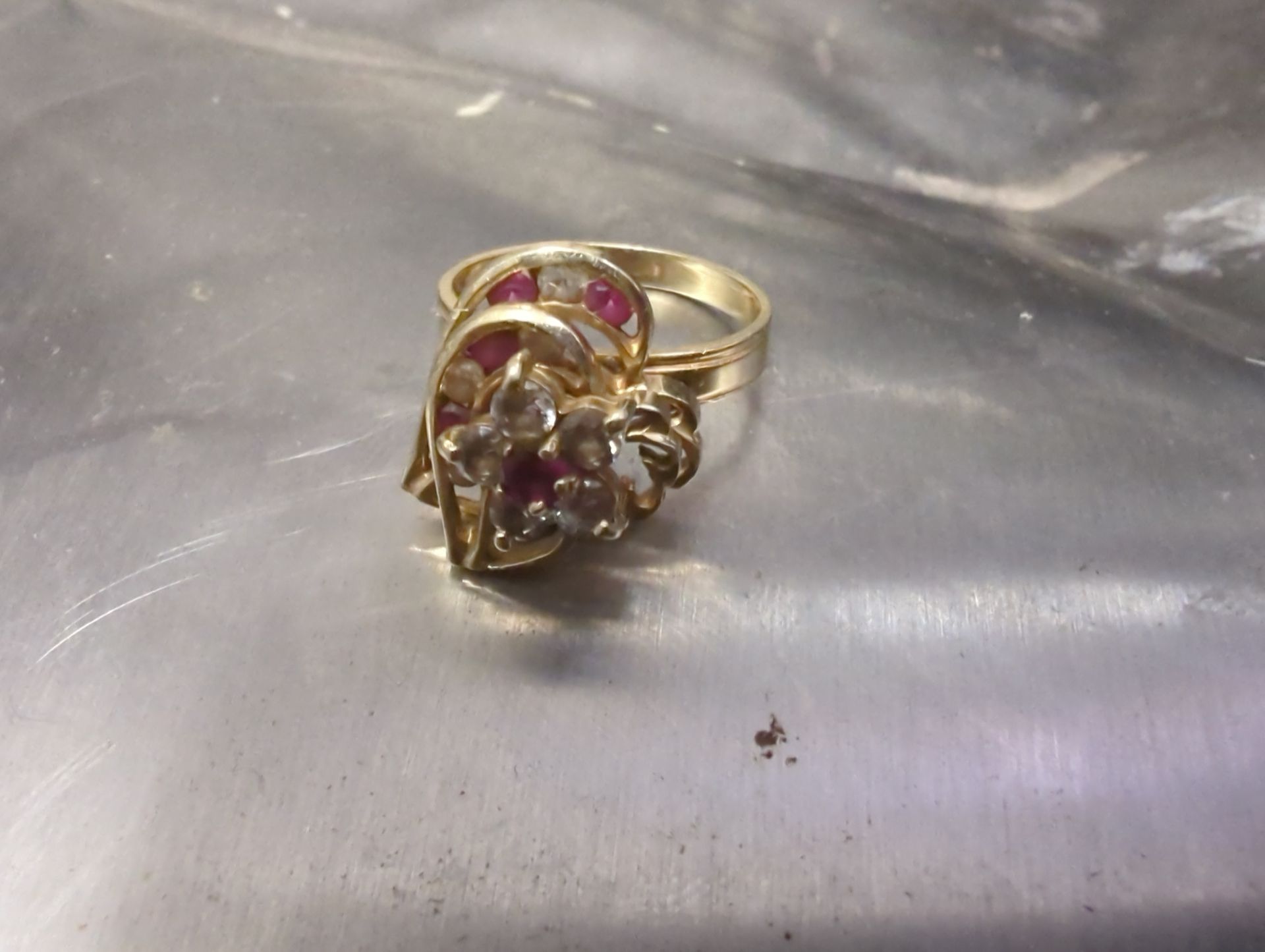 This stunning 14K yellow gold cocktail ring features an elegant cluster setting with multiple prong-set diamonds (or diamond accents) arranged in a raised, layered floral/cluster design. The setting has a tiered, open-work basket construction that allows light to pass through and illuminate the stones. The band is a classic smooth yellow gold shank. This ring has a bold, eye-catching presence β perfect as a statement piece or vintage-style cocktail ring. Details: Metal: 14K Yellow Gold (stamped) Style: Cluster / Cocktail Ring Setting: Multi-prong open basket Stone(s): Diamond cluster (quantity/total carat weight to be verified) Condition: Pre-owned, good condition