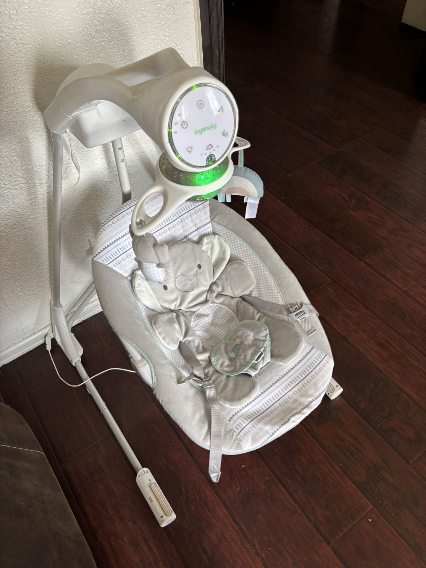 Ingenuity baby elephant swing in great condition , gently used and everything works like the music , swing , lights , volume and timer . Comes with charging cable as well