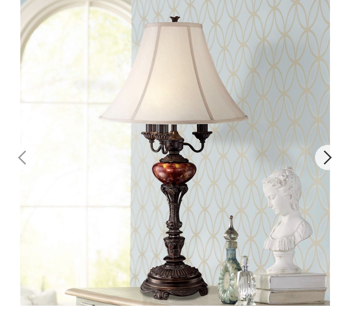Rhys 4-Light Tortoise Shell Glass Font Table Lamp Make this beautiful vintage lamp a part of your home! Everything works and it has been taken care of really well. Selling it for $100 More details: An ornately detailed traditional vintage style lamp with a tortoise shell font detail in a soft amber color. Topped with an off-white bell lamp shade. Constructed in metal and glass. A 6-way switch adds versatility to complete the look. 34" high overall. Shade is 9" across the top x 20" across the bottom x 11 1/4" high. Weighs 8 lbs. Features three candelabra arms around a center light: takes three 40 watt bulbs and one 150 watt bulb (bulbs not included). One 3-way switch for candelabra arms. On-off switch for top light. Traditional table lamp by Barnes and Ivy, Features a tortoise shell font accent. Detailed base comes in an English bronze finish. Metal and glass construction. Off-white bell lamp shade with self trim. 8-foot long cord.