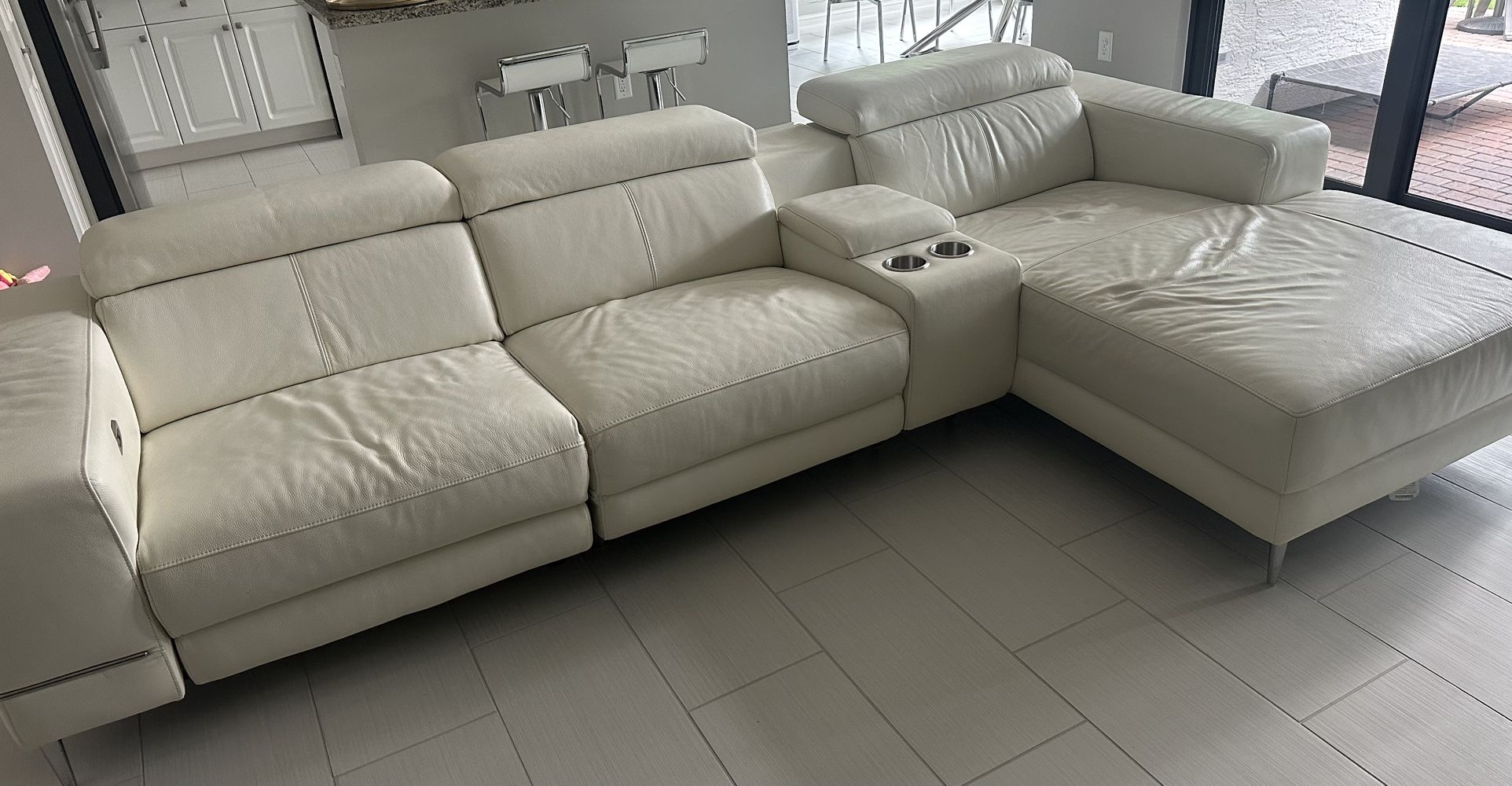 Modern white leather sectional sofa from Modani featuring a chaise lounge, power recliner, built-in center console, and USB charging port.
