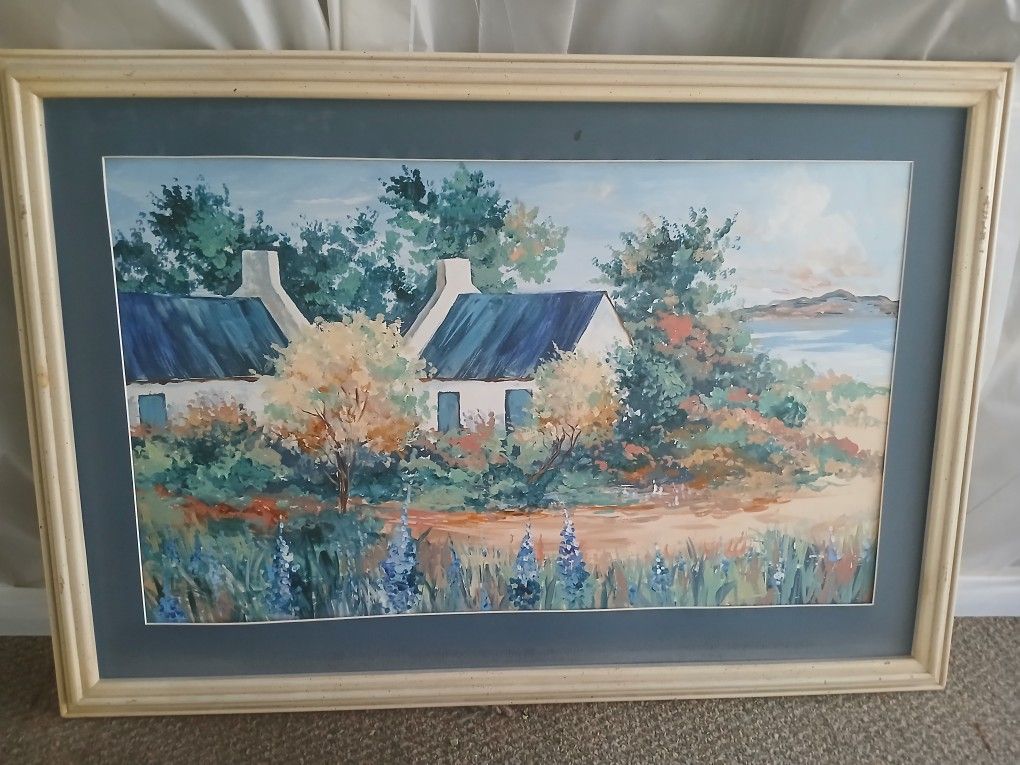 Large Original Oil A beautiful, unsigned original oil painting full of texture and character. This expansive 39" x 27" work depicts a traditional white-walled cottage against a lush, blooming garden and distant hills. The brushwork is confident and thick, typical of high-quality mid-century landscape art. No signature, but the craftsmanship and scale suggest a professional hand. A fantastic find for collectors of nautical or architectural art. Ready to hang and transform your space. Asking Price: $475