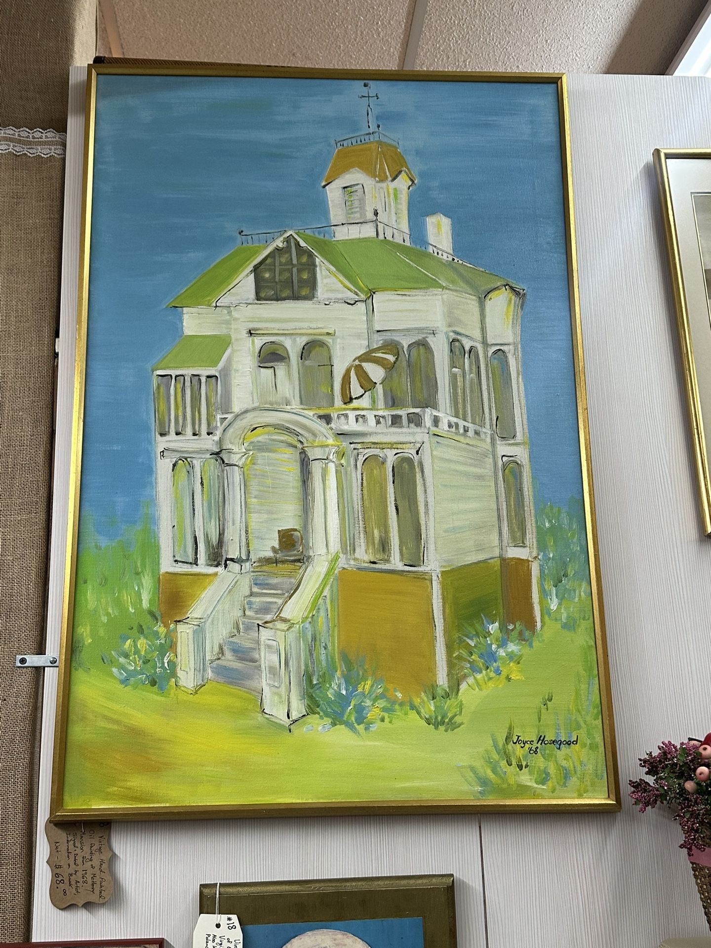 A large vintage oil painting painted in 1968 of McHenry Mansion, by artist Joyce Hosegood. Framed in a gold frame. Information about artist and price on back of painting. Located in - Main Street Antiques 208 E. Main Street Turlock, Ca. 95380 Located in Booth 18. Ask for #18, there are two locations for 18 in this store. Price is $68.00 Plus Tax.