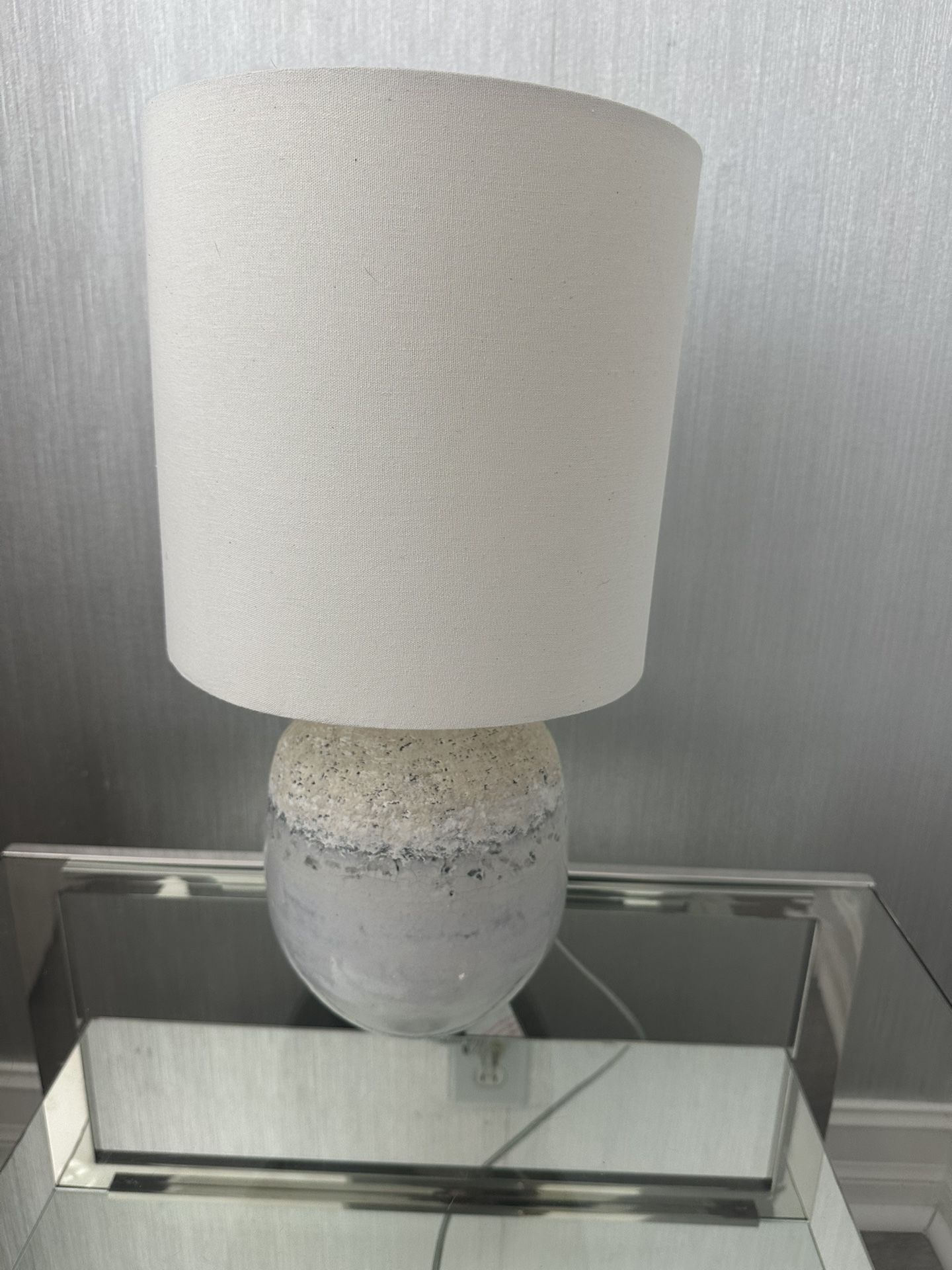 Modern Crate & Barrel table lamp with textured ceramic base and neutral linen shade. Clean, simple design that works well in bedrooms, living rooms, or offices. Lamp is in excellent condition and fully functional – no stains, damage, or issues.