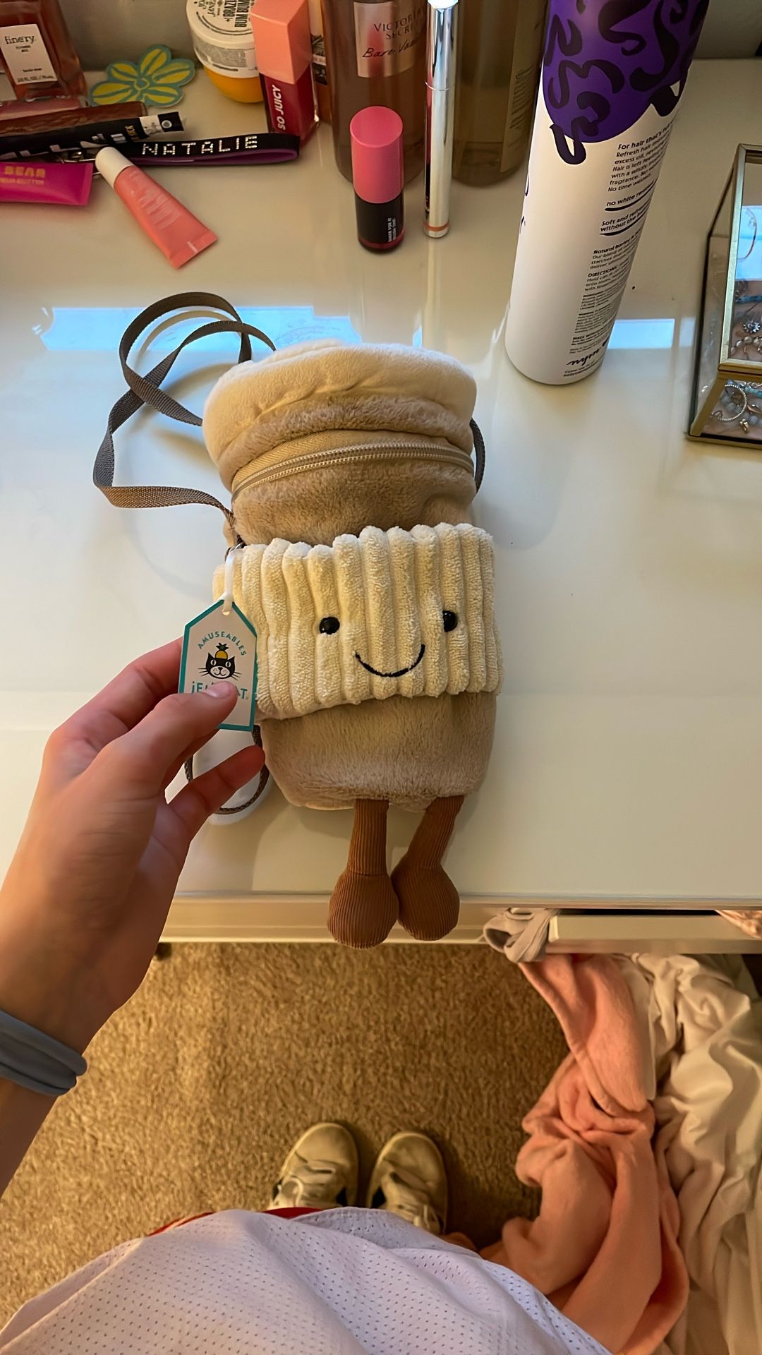 This is the jelly cat coffee purse! I have not used it yet and also has tags. It’s has no stains or anything else. It is brand new and has the zipper.