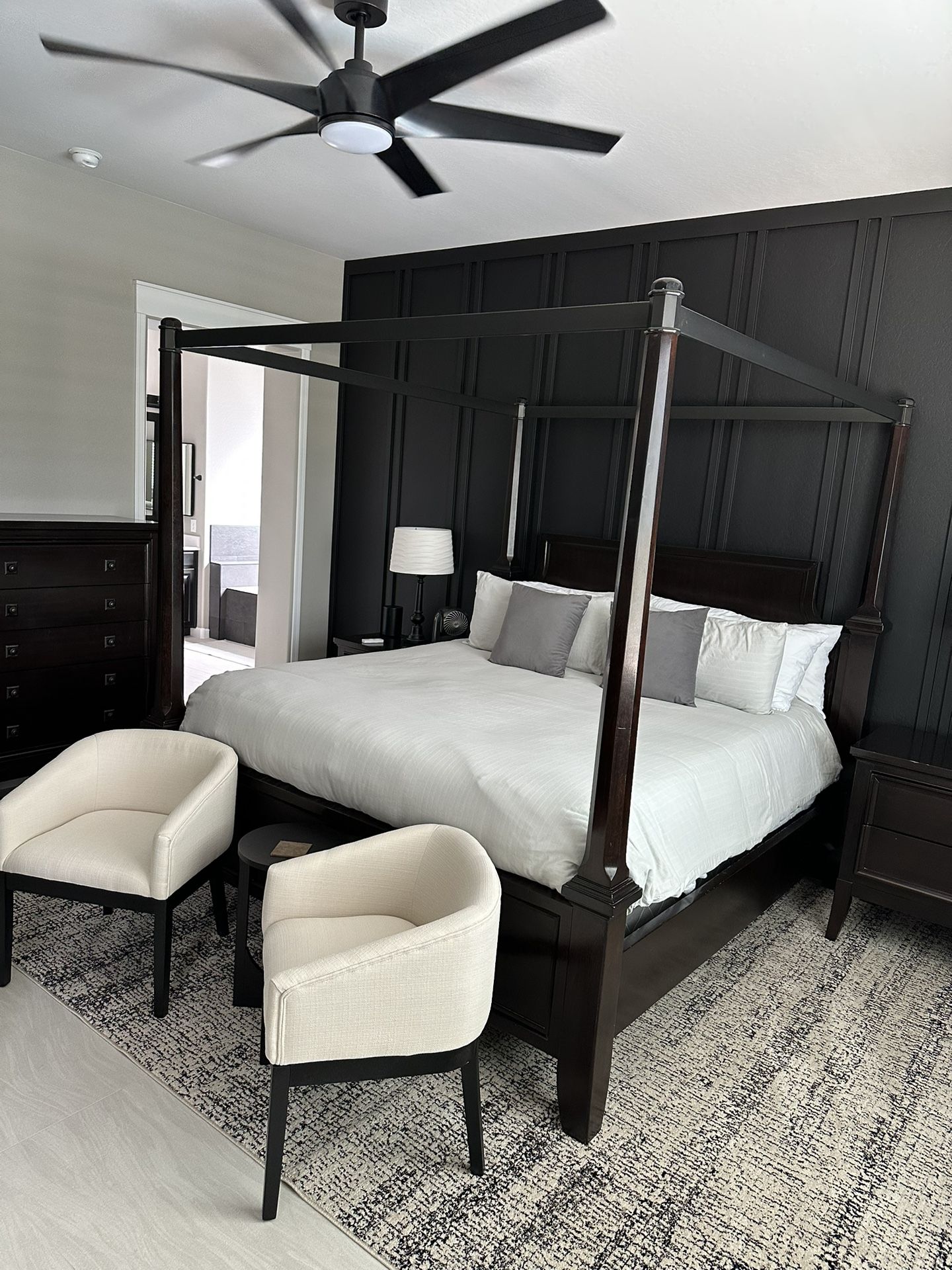 King/Cal King Canopy bed (Mattress not included) 2 nightstands 1 dresser 1 chest of drawers