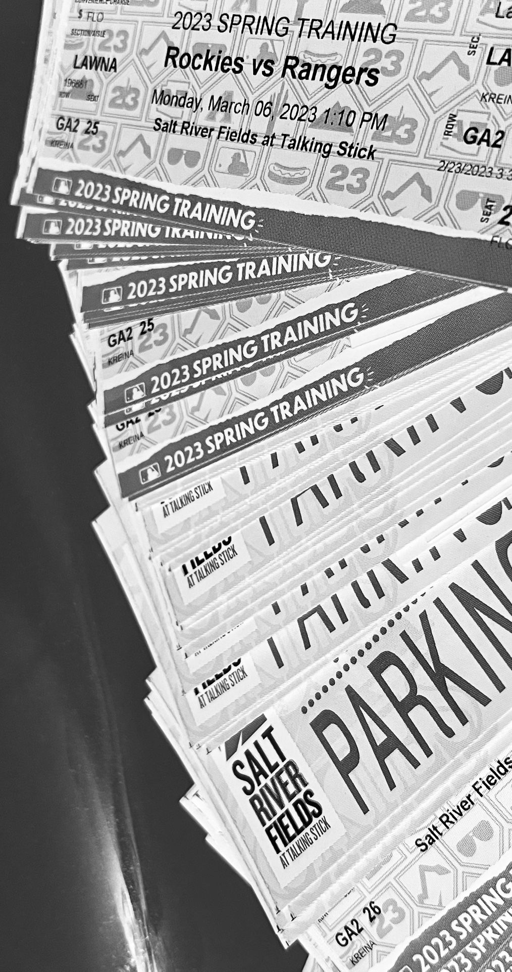 Hi! I have 2 LAWN A TICKETS for every single home game that the Rockies play for Spring Training 2023! Every game also includes a free parking pass! All home games are played at Salt River Fields- when the Dbacks are “on the road.” There are still many games left in the season! Make an offer- thanks!