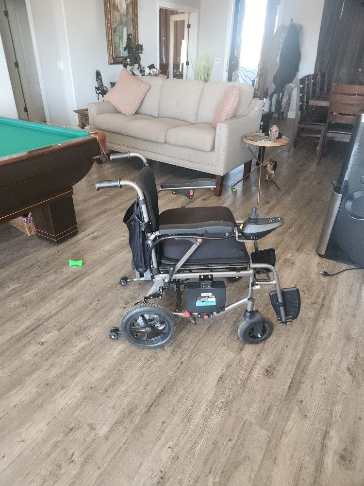 This is like brand new and used by my Father for a few months. Bought in 2025. It is light weight and he easy to put in your car. Bought the extra padding for the seat and bag for the back. Make your life easier and your parents feeling independent. We paid $700 plus.