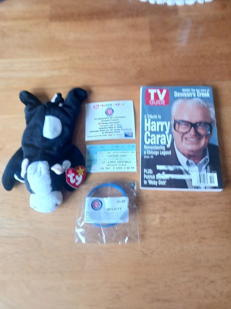 Harry Caray Beanie Baby. Only 10,000 were given out on May 3rd, 1998. In perfect condition. It's been in a zip lock bag since day. I only took it out to take these pictures. Comes with the original certificate of authentication and that games ticket stub. Also included is a Cubs " BELIEVE" bracelet and a TV Guide issue of a tribute to Harry Caray.