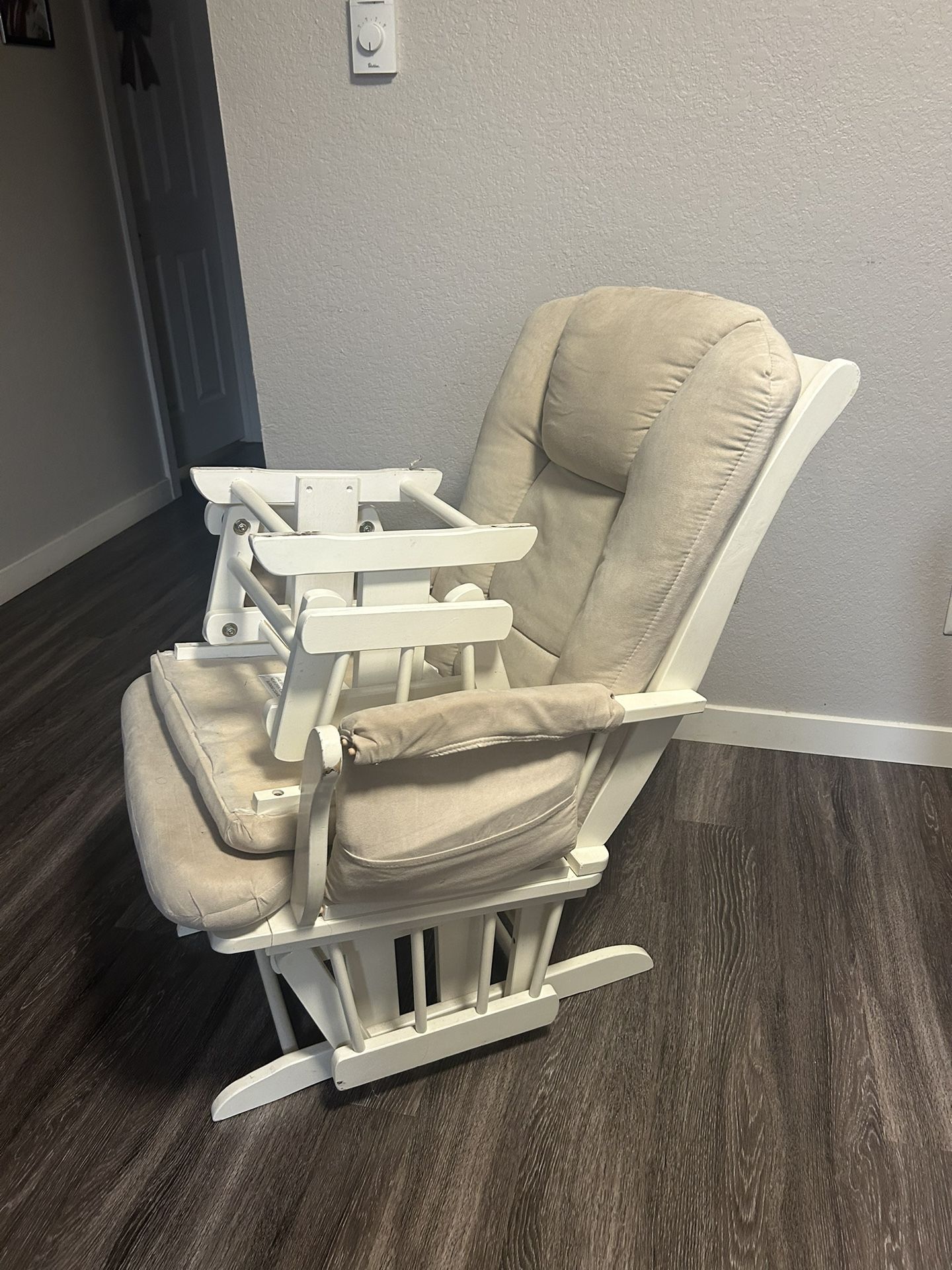 Gently used rocking chair was in my nursery Loose arm can be fixed with wood glue If not claimed by 8pm tonight it will get tossed in the dump Wanted to try one more time to give to a good home before doing so. Dog friendly home but dog was never allowed in the nursery Smoke free home