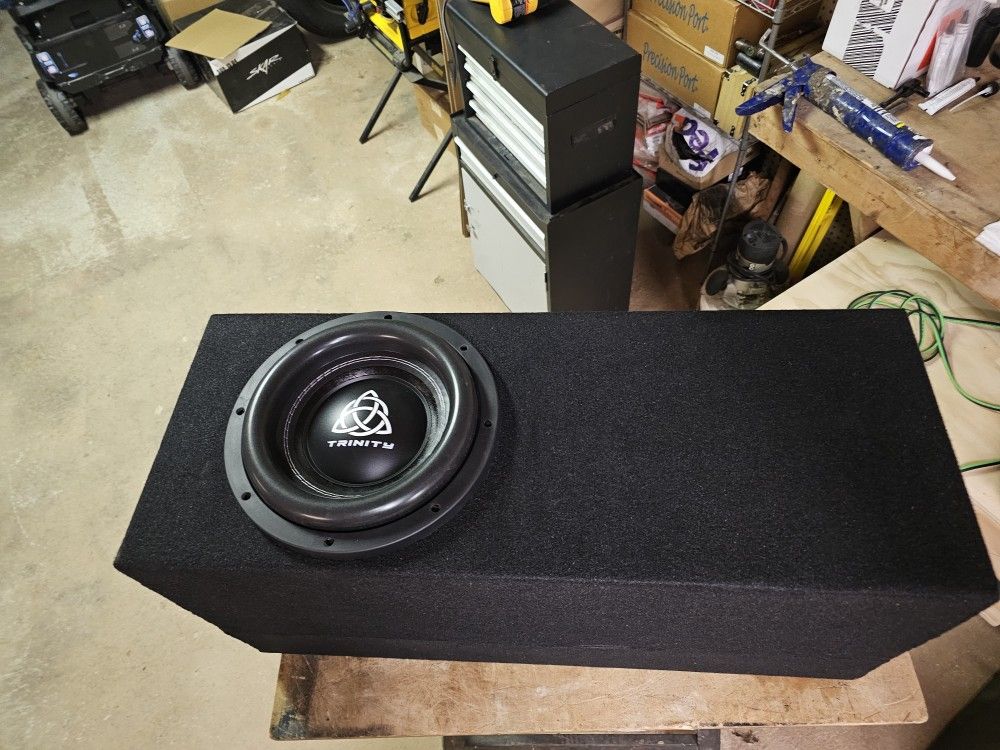 Single Trinity B Series 10 in my custom 1.5 cuft vented enclosure tuned to 33hz carpeted in black. Sub is 1500 watts rms dual 2 ohms and will be wired down to a 1 ohm load. Good for any car and will fit almost all small cars like Chargers, Challenger, Mustang and Camaros and will bring tons of pressure from a single sub setup.