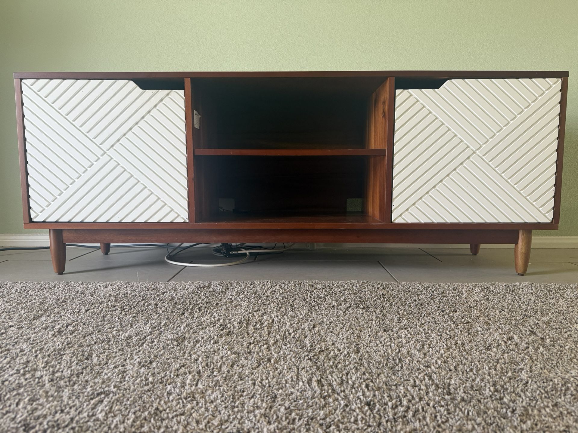 Beautiful mid-century modern media cabinet in a warm walnut-style wood finish with eye-catching white geometric sliding doors. This piece combines style and function and works perfectly as a TV stand, media console, or accent storage cabinet.