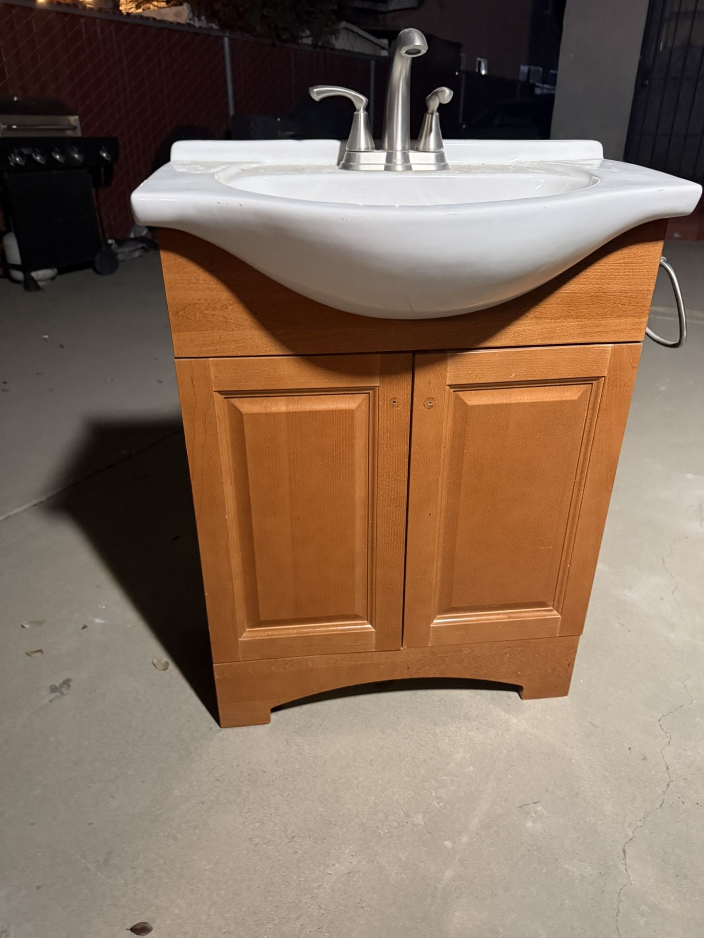 Used vanity with sink ,faucet and toilet paper holder , still in good shape minor scratches. 26 wide Asking $200