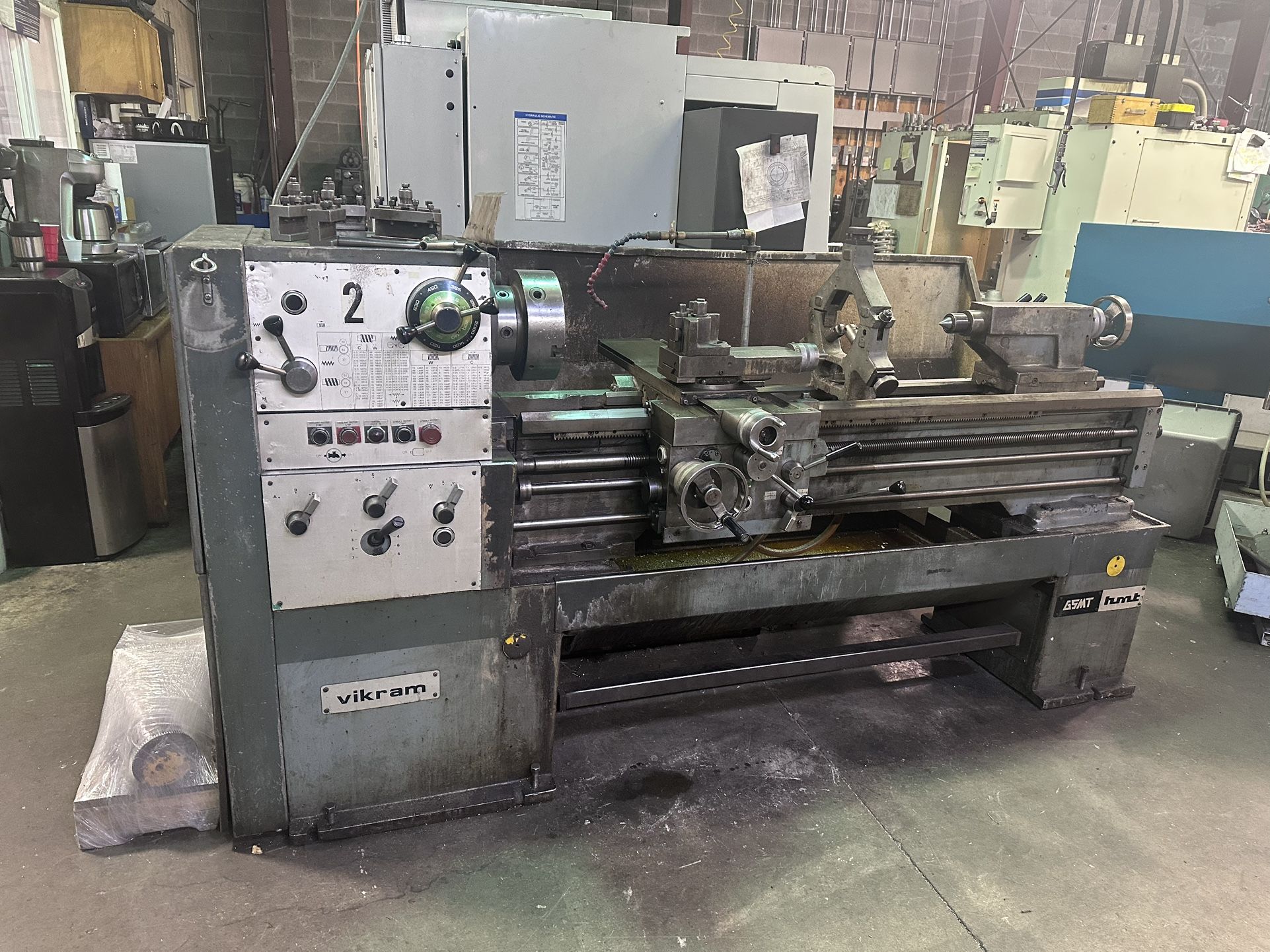 Vikram GSMT hmt lathe 16” swing over bed capacity 48” length capacity 10” chuck Comes with 5 tool holders and everything that comes with the lathe 480 voltage Everything works fine on the machine. Give me offers.