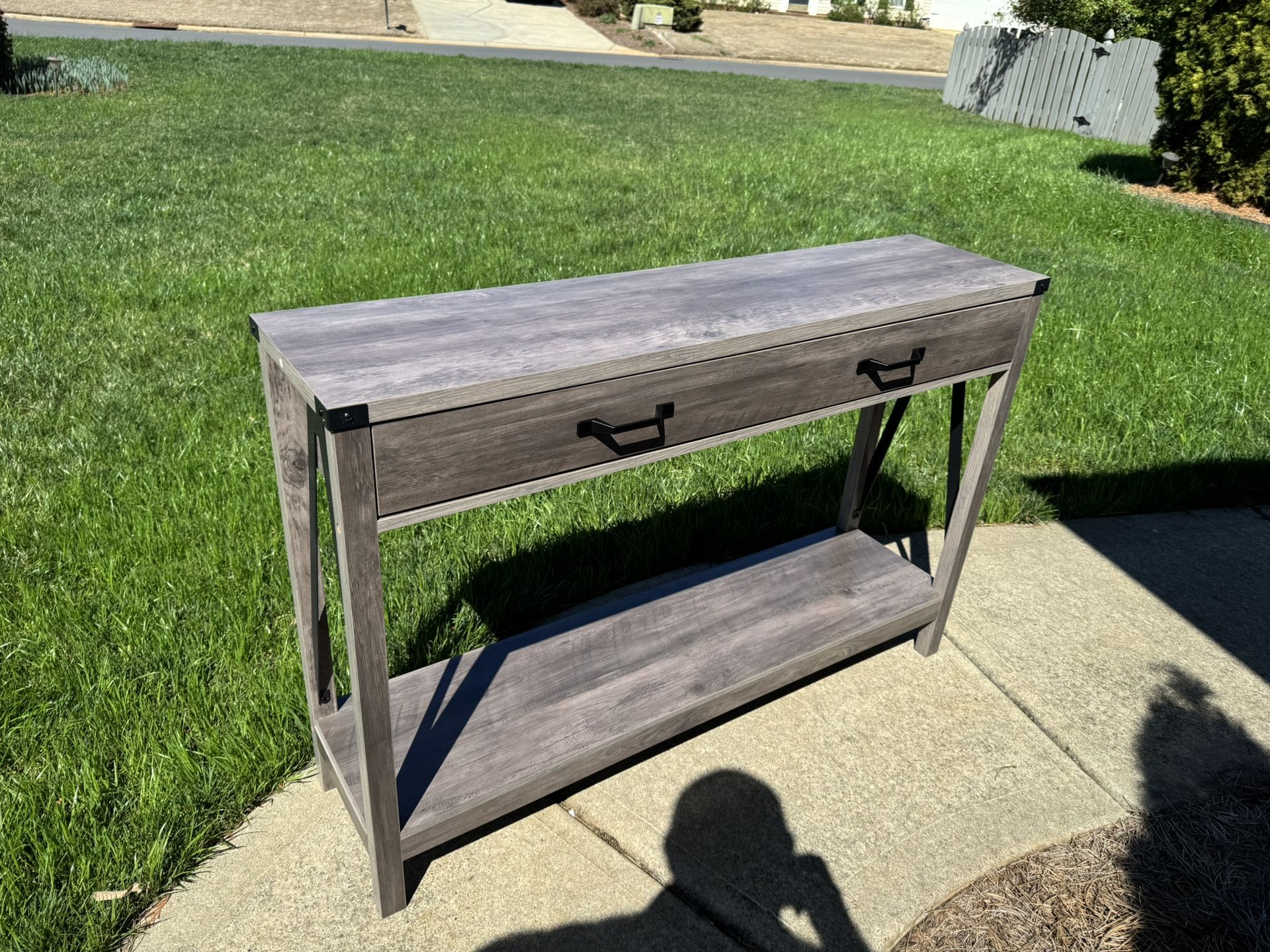 Only cash.Pickup only. • Farmhouse Style】The console table adopts retro grey, combined with iron elements added in the details, integrating farmhouse and industrial styles • 【Sturdy & Durable Structure】Made of high-quality MDF, the side A-type structural design enhances overall stability, which is both beautiful and practical • 【Ample Storage Space】Different from the regular size, the extended size of 47.2 inches long and equipped with 1 spacious drawer provides storage space for your daily items. The open shelf is also great for placing decorations and storage baskets • 【Multiple Uses】This entryway table is a good choice for storing and displaying items. Whether it is placed in the entrance, living room, dining room, study, etc., it can meet the diverse needs of the family