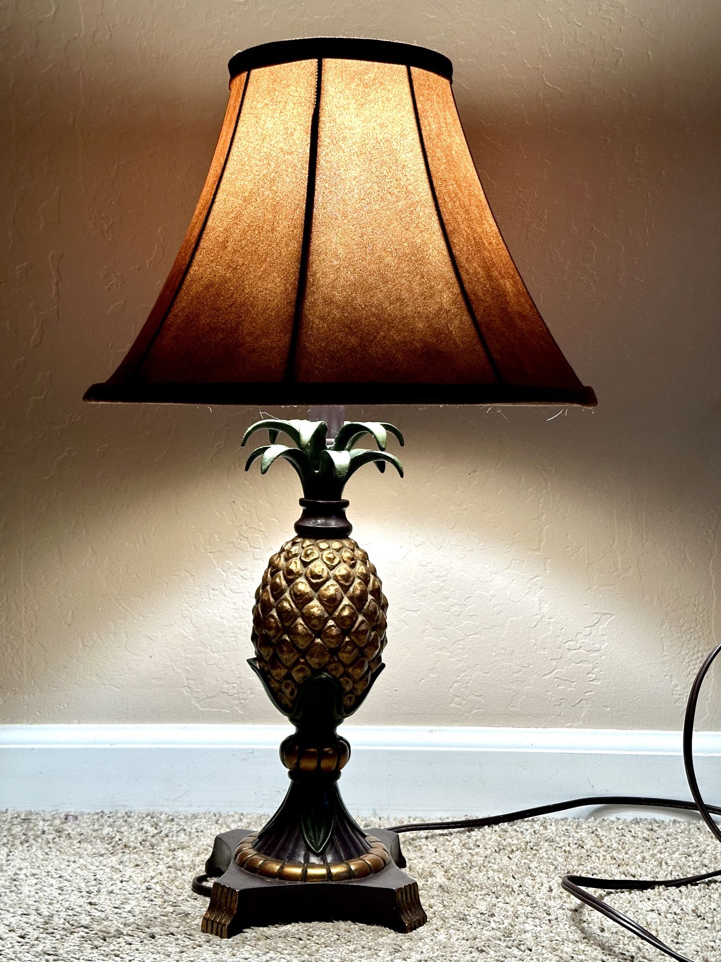 Pineapple Table Lamp with Suede Shade. Excellent, preowned condition. Previous owner that I got it from did smoke; however, I have wiped the entire lamp with lemon scented disinfectant wipes. Measures 24” tall and weighs 7 lbs 5 oz. Asking $13. Location: DeWolf and Ashlan area.