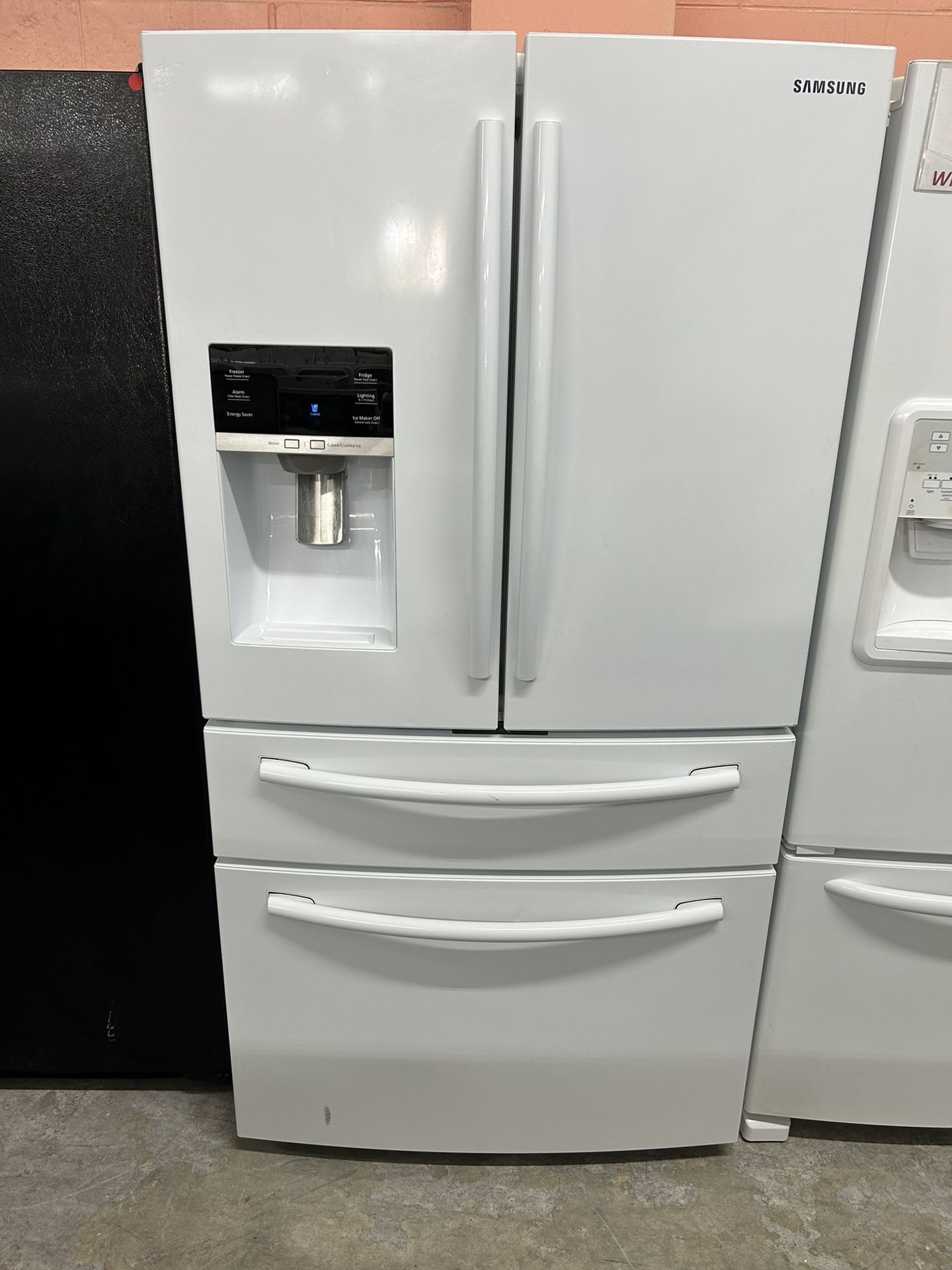 Samsung 28 cubic foot white 4 door french door refrigerator with dispenser, 35 3/4” wide 68 1/2” high and 32” deep. Food section has adjustable spill proof glass shelves 2 humidity controlled crispers and gallon size door bins. Middle draw is all deli draw with its own flex zone temperature control. Bottom draw is freezer with 2 solid plastic baskets. Refrigerator is plugged in and running. Comes with warranty. Financing and delivery available. Questions please call three two one (contact info removed).