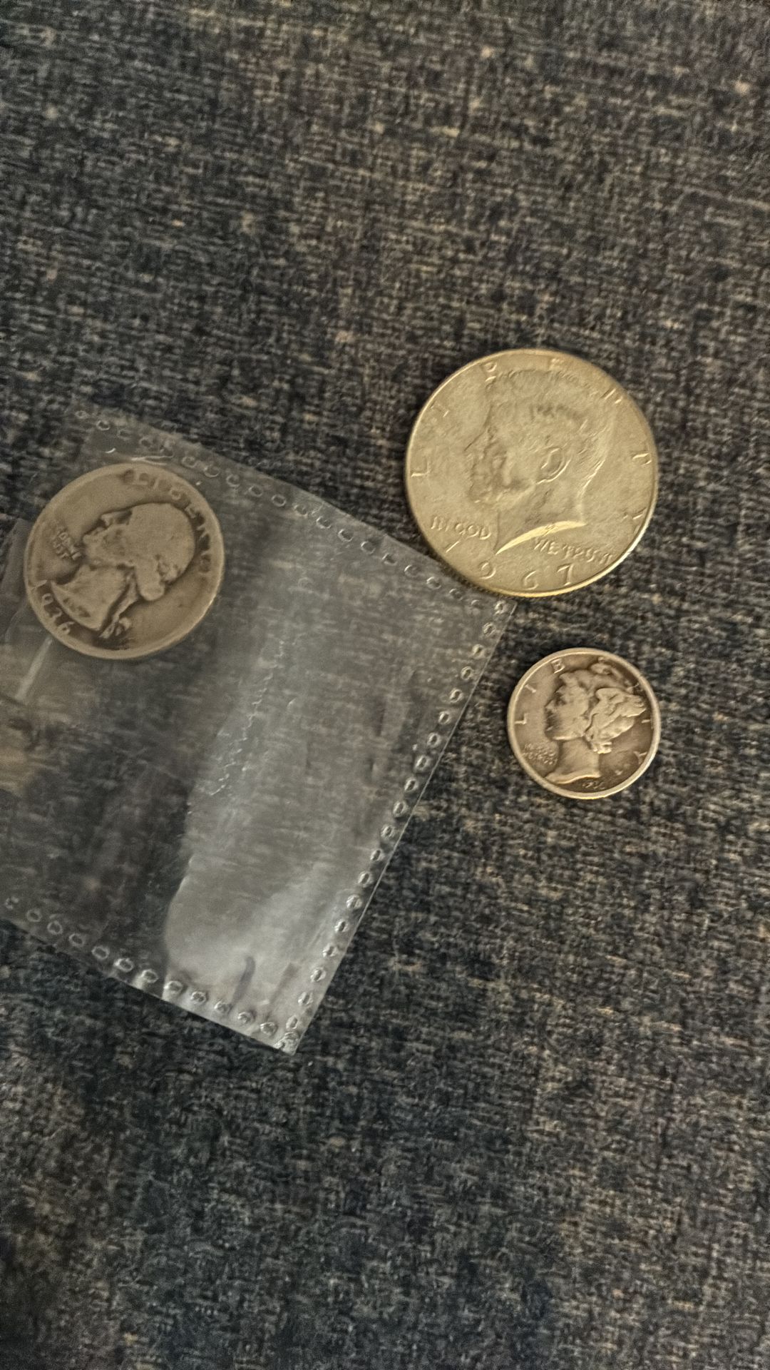 1967 40% silver half dollar, 1936 90% silver mercury dime and 1936 90% silver quarter