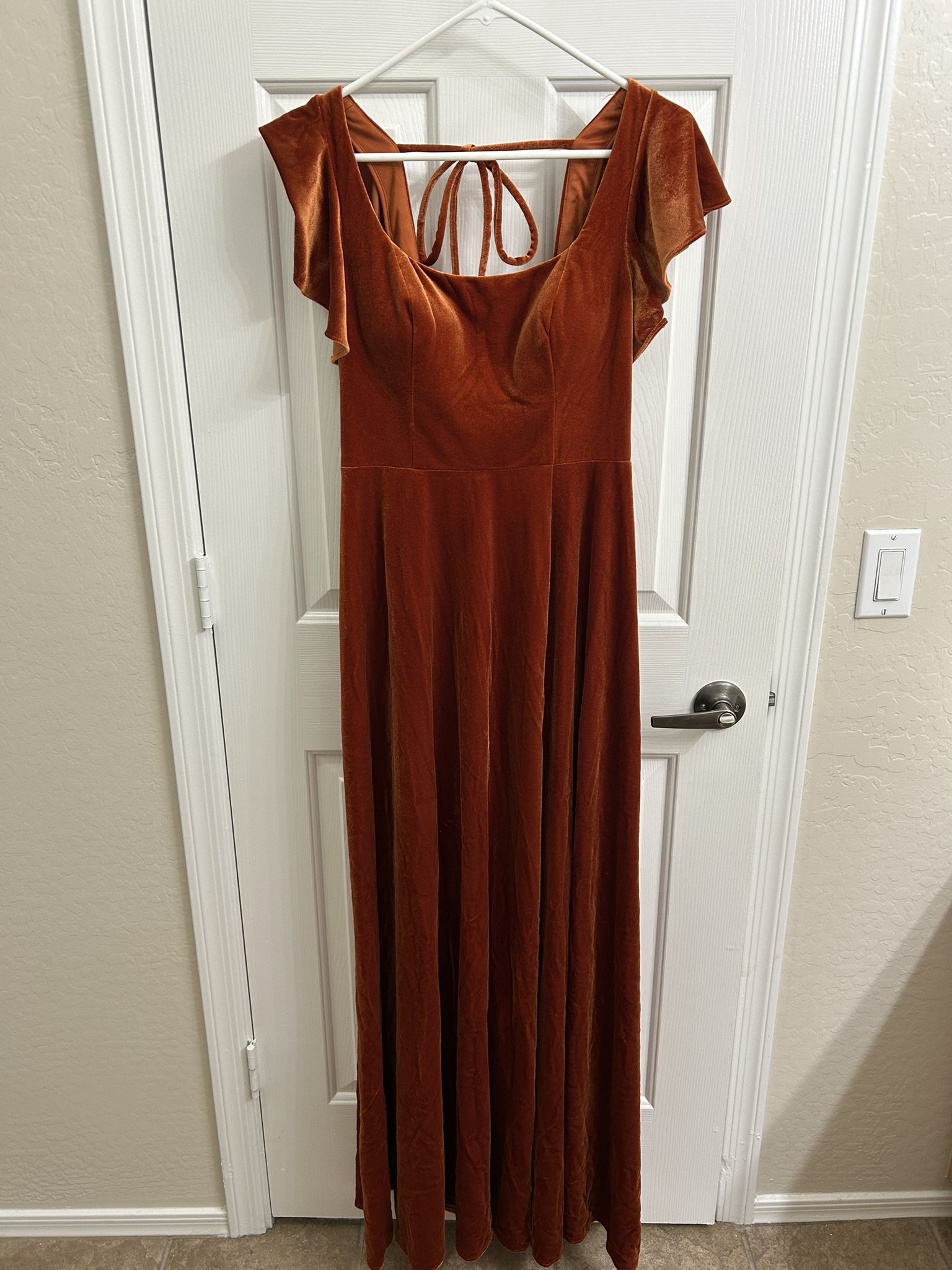 Azazie bridesmaid dress. Purchased this dress in July 2025. - never altered or worn. Only tried on for fit. - BRAND NEW - beautiful fit and very flattering - size 8 - color: Burnt Orange - built in bra cups - material: velvet Cash only