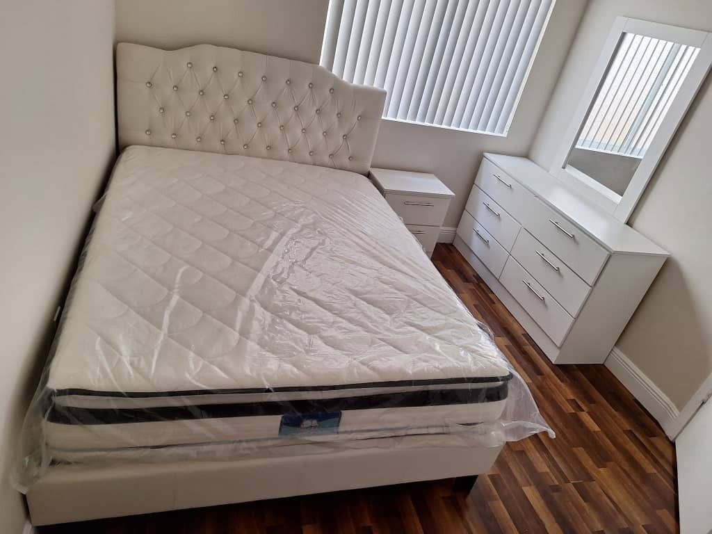 QUEEN SIZE BED, MATTRESS, DRESSER WITH MIRROR AND TWO NIGHTSTANDS 🆕️