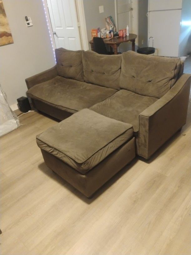 Dark brown sectional sofa . The cushions are a bit dirty and needs to be cleaned and back bracket is loose/broken in place with a nail