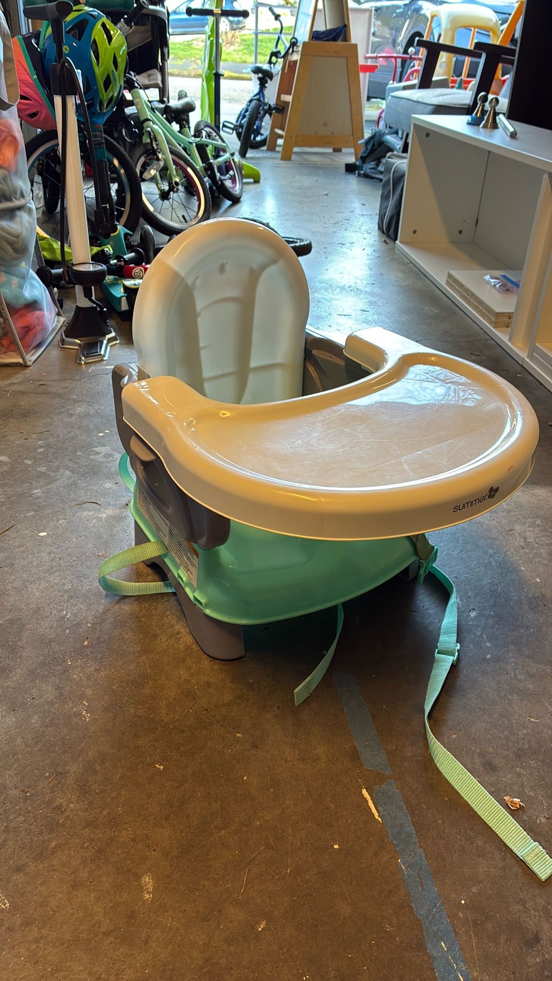 Straps onto any chair. Great high chair seat for travel! Folds down small!