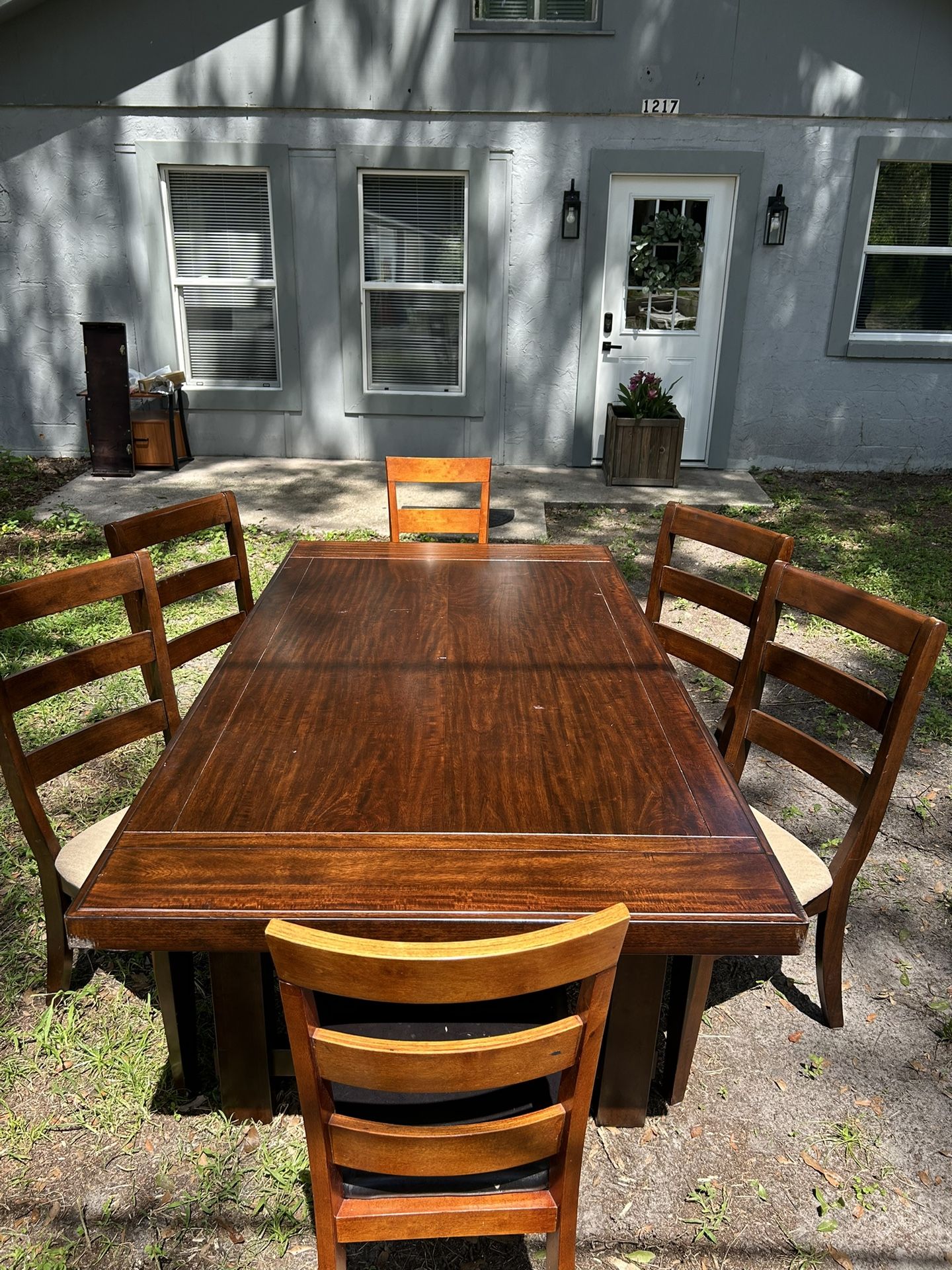 Selling big table with 6 chairs. Overall in good condition, you can see some scratches but nothing serious. Have extension to expand table for 10 seats. 4 original chairs and 2 are extra. There is also upholstered bench . Table already disassembled. Text me for more info. Can deliver for a fee