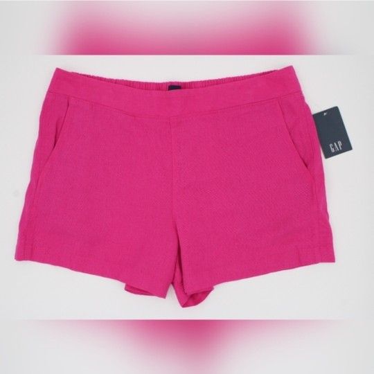 New with tags GAP women’s shorts in pink linen blend. Size XL with elastic waistband for comfort. Features four pockets (two front, two back). Approximate measurements: 18–19" waist (stretched/relaxed), 14" length, 7" inseam.