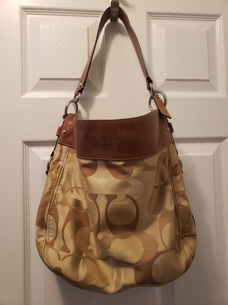 Large authentic Coach leather trim and strap handbag. Inside zippered pocket with cell phone holder and 2 additional open pockets inside. There is a small spot on bag as shown on photo. In great condition.