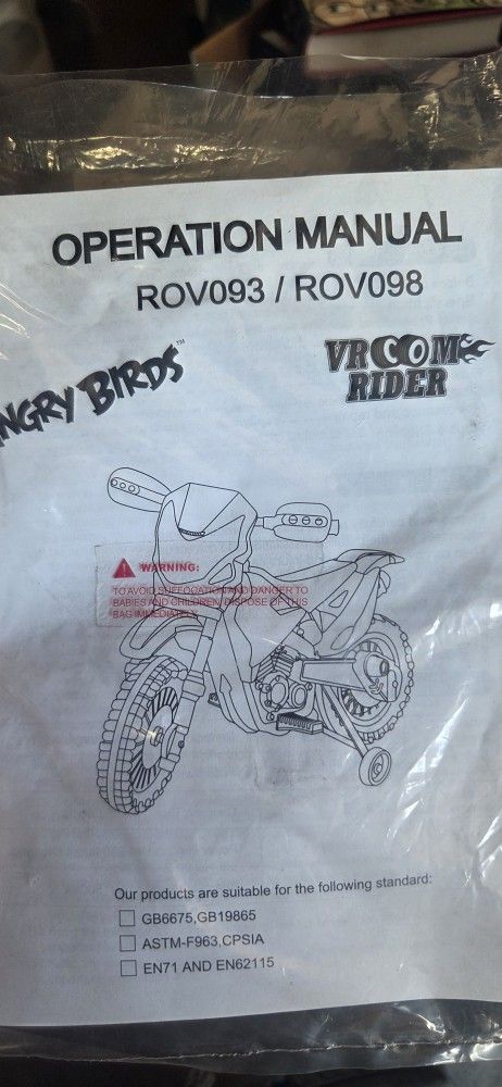 Have fun riding with the Angry Birds Battery Operated Dirt Bike from Vroom Rider! Kids can experience the excitement of dirt bike riding with this Angry Birds Battery Operated Dirt Bike. It will bring excitement to every kids play time New in the box