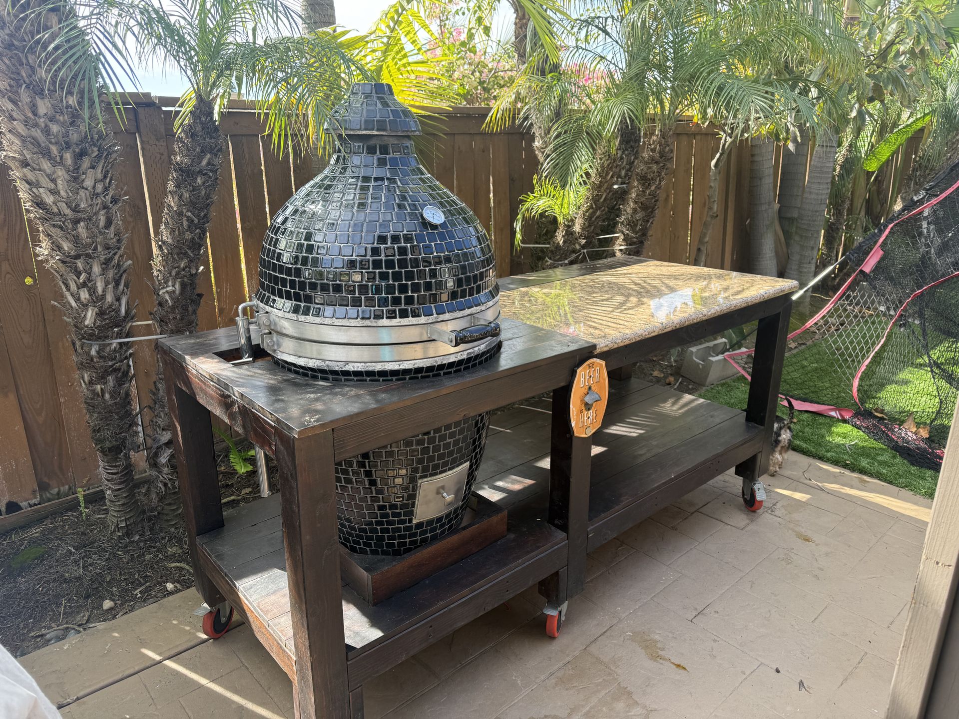 Comes with a custom built table and gas converter to switch from charcoal to gas grill/smoker. 22 inches of 1st cooking grate, with an additional 18 inches of an extra cooking grate add-on(see photo). Table dimensions: 84”W ( left to right), 39”H, 33”D ( front to back). Kamado grill height = 49” Cash only, pickup only.