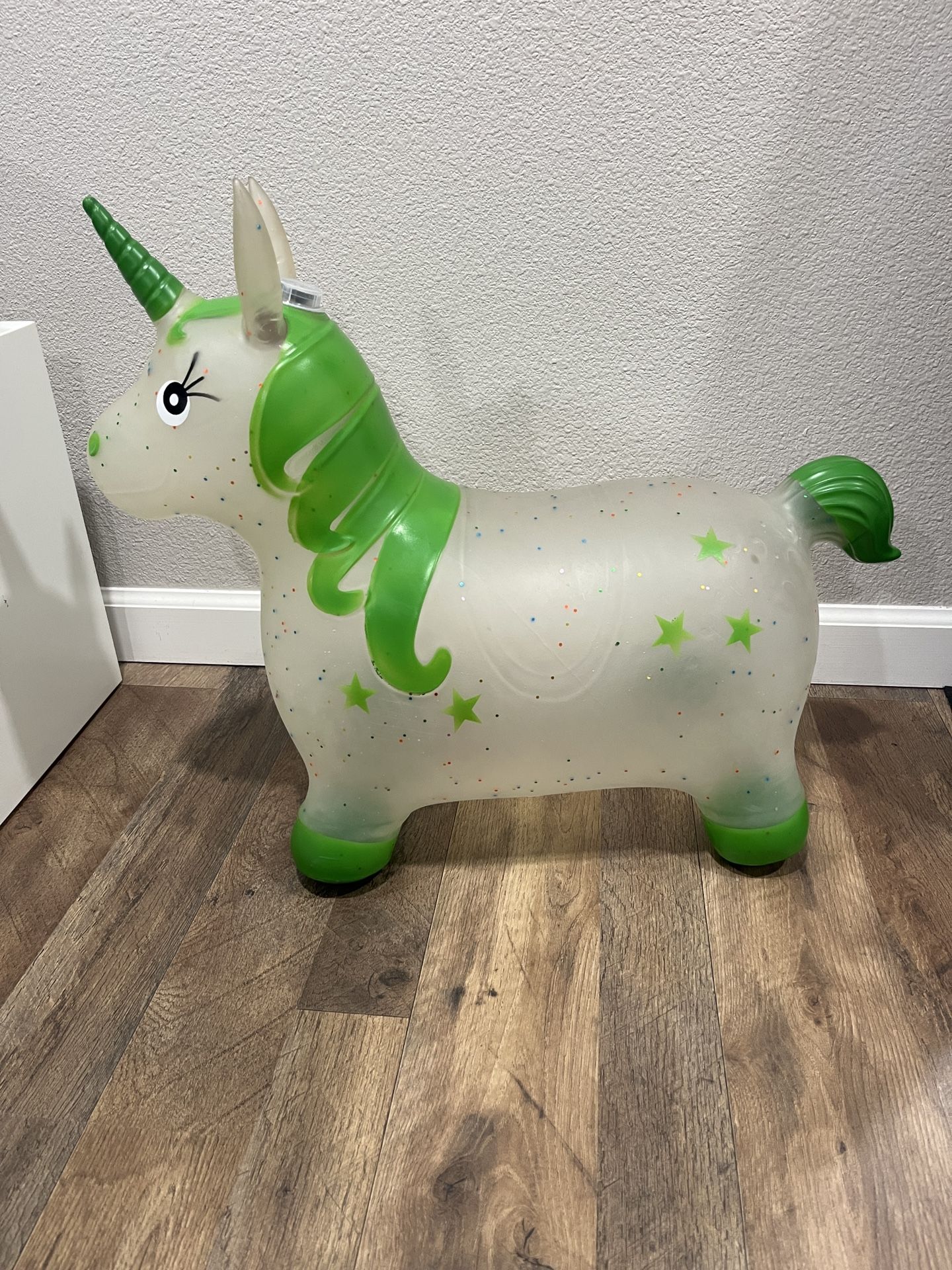 Toddler bounce around unicorn lights up n plays twinkle twinkle little star. Great condition my 4 year old just got to tall for it. Easy to inflate n dis inflate.