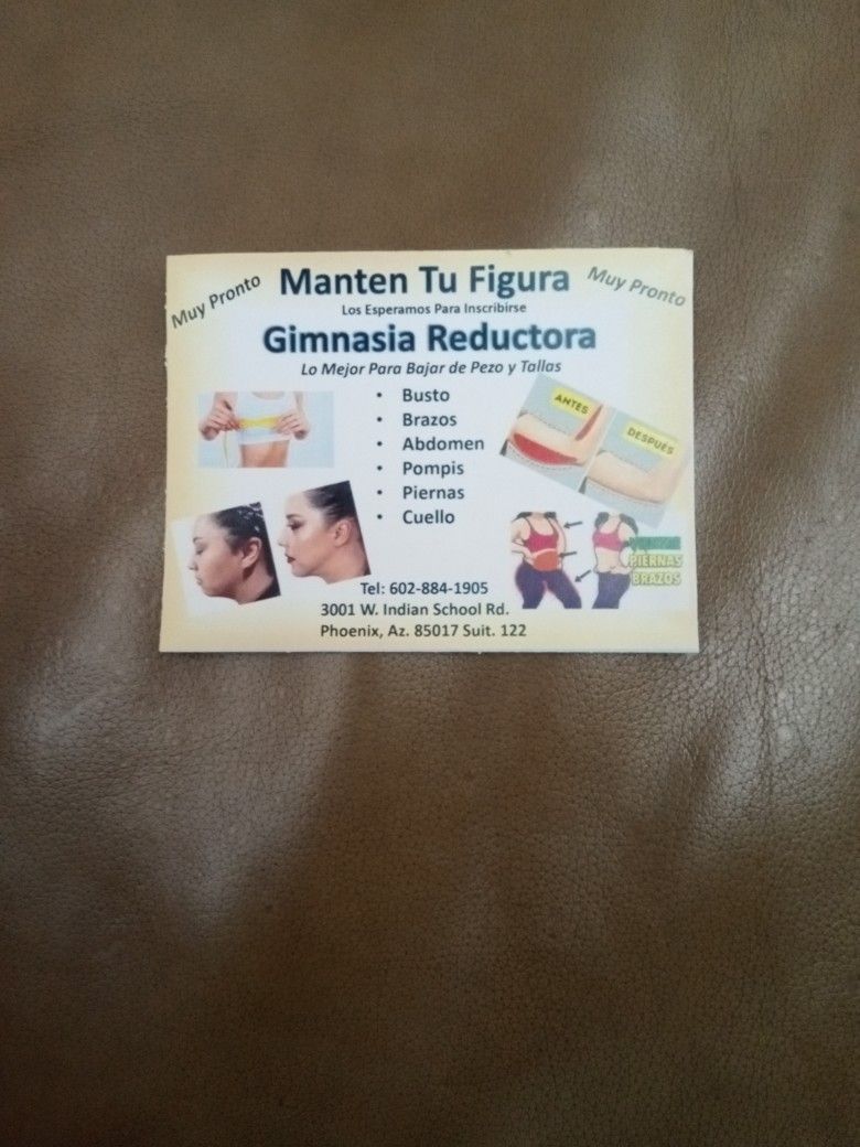 Gimnasia Reductora lo mejor para bajar de peso y reafirmar busto pompis abdomen(contact info removed) piernas y cuello horas Lunes a viernes de 10 AM. A 11 PM y de 6PM a 7 PM 3001 W indian school rd Phoenix Arizona # 122