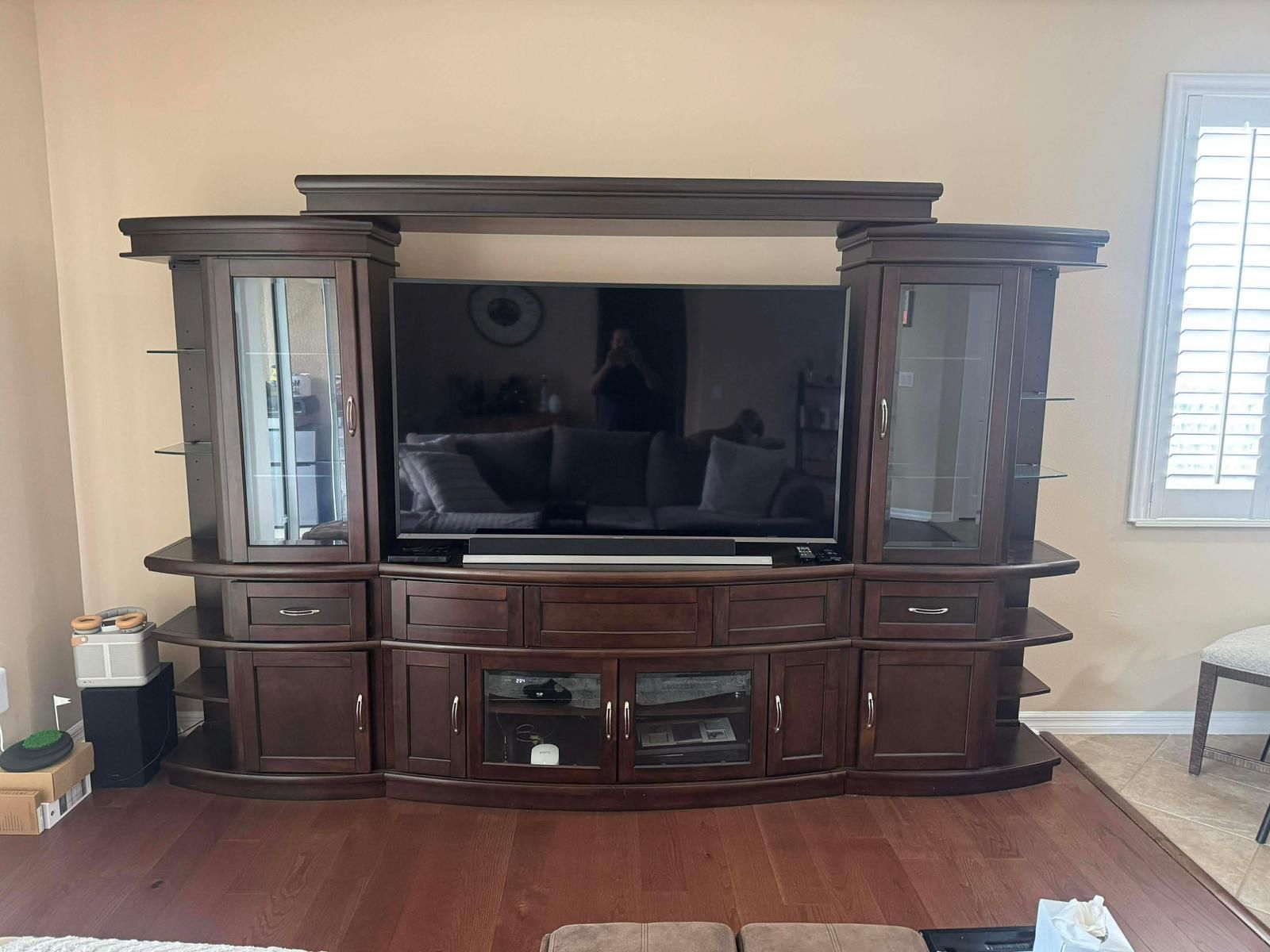 Solid Wood Entertainment Center with Glass Display Cabinets