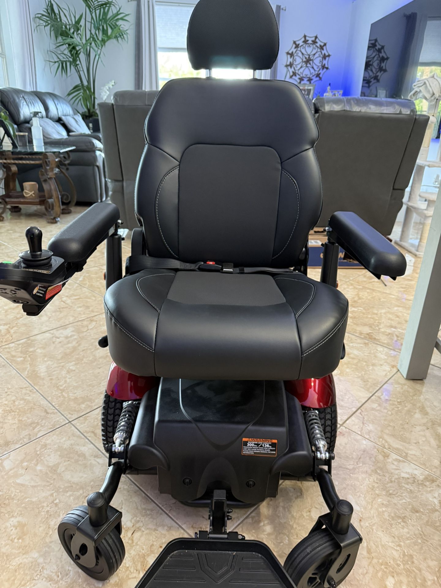 Full front and rear suspension Mid-wheel, highly maneuverable driving Weight Capacity: up to 450 lbs Range: 20 miles Optional seat elevator for 10" of lift *reduces weight capacity to 400 lbs. Real mid-wheel drive design for tight space maneuverability