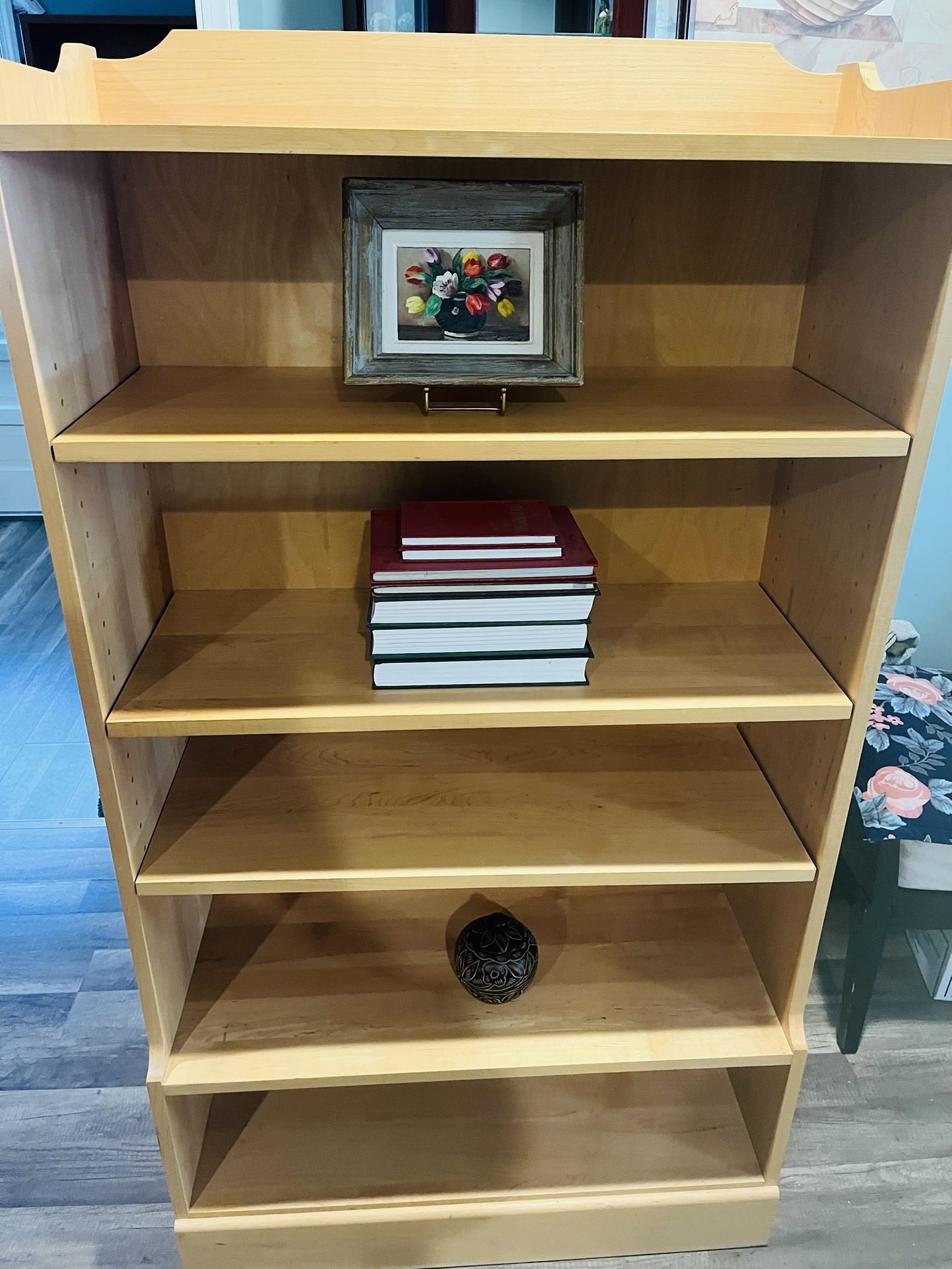 Great quality, birch wood bookshelf, perfect for office or kids room. Very heavy. Measures 59” tall, 12” deep and 32” wide.