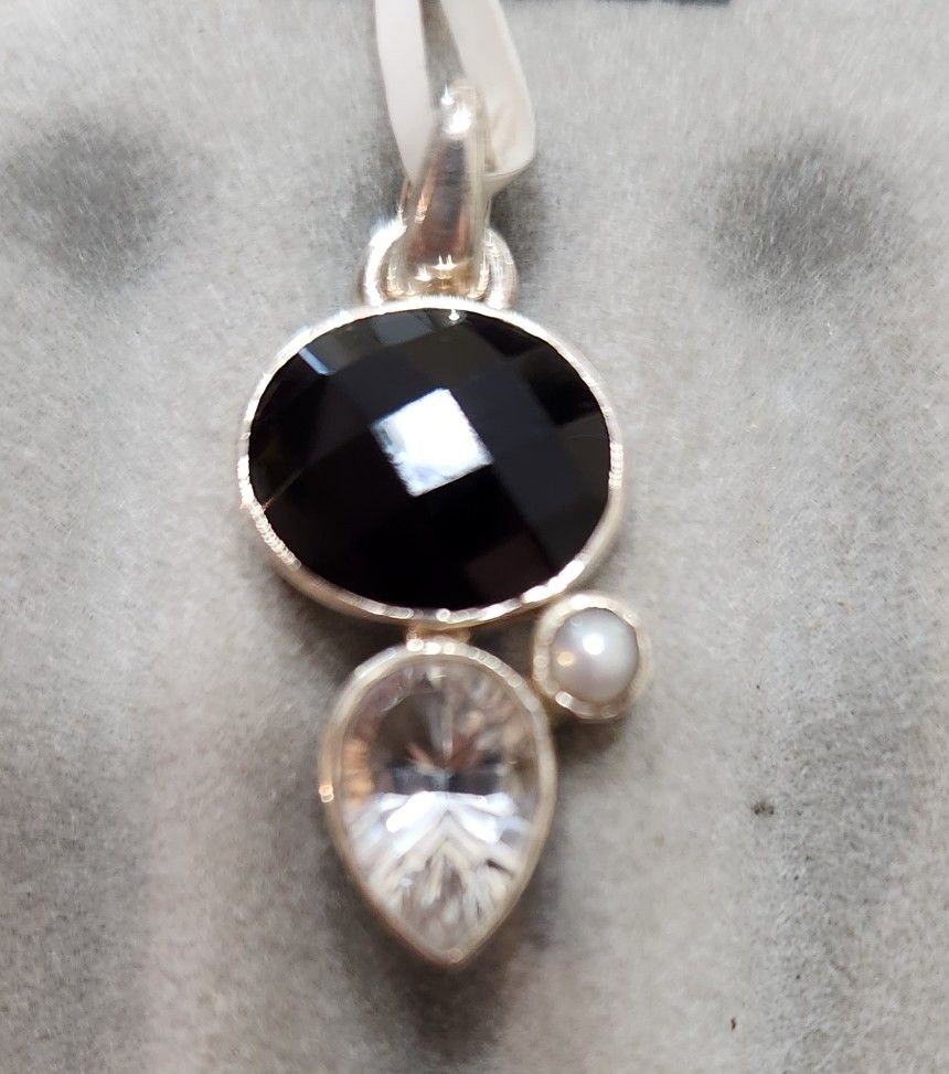 Genuine silver pendant holding a black onyx stone, crystal stone and pearl. Still holds original tag ($38), does NOT come with a chain.