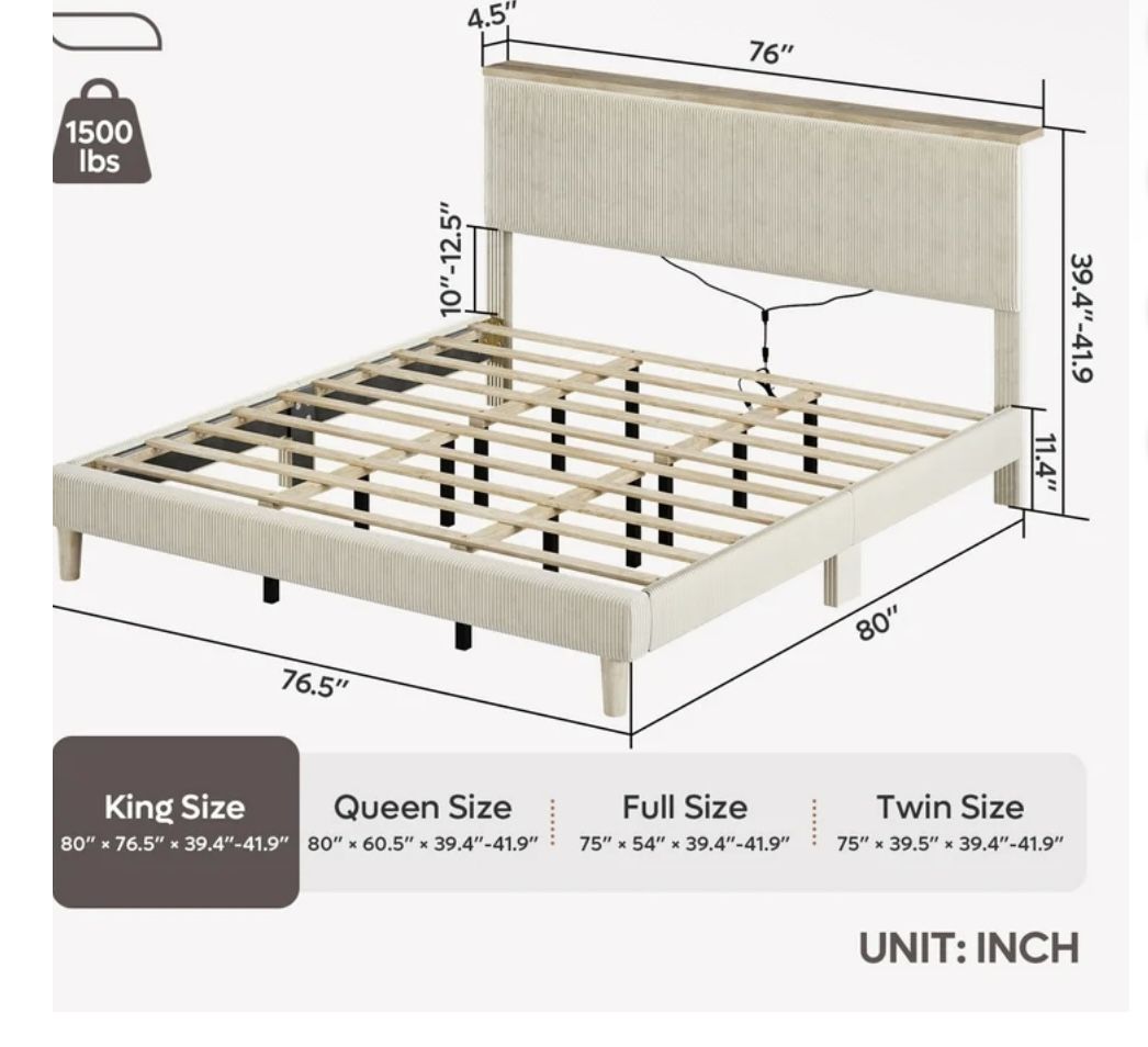 Modern cream corduroy king bed frame, just 1 year old and barely used. No stains or damage—looks almost new. Sturdy, clean, and adds a cozy aesthetic to any bedroom.