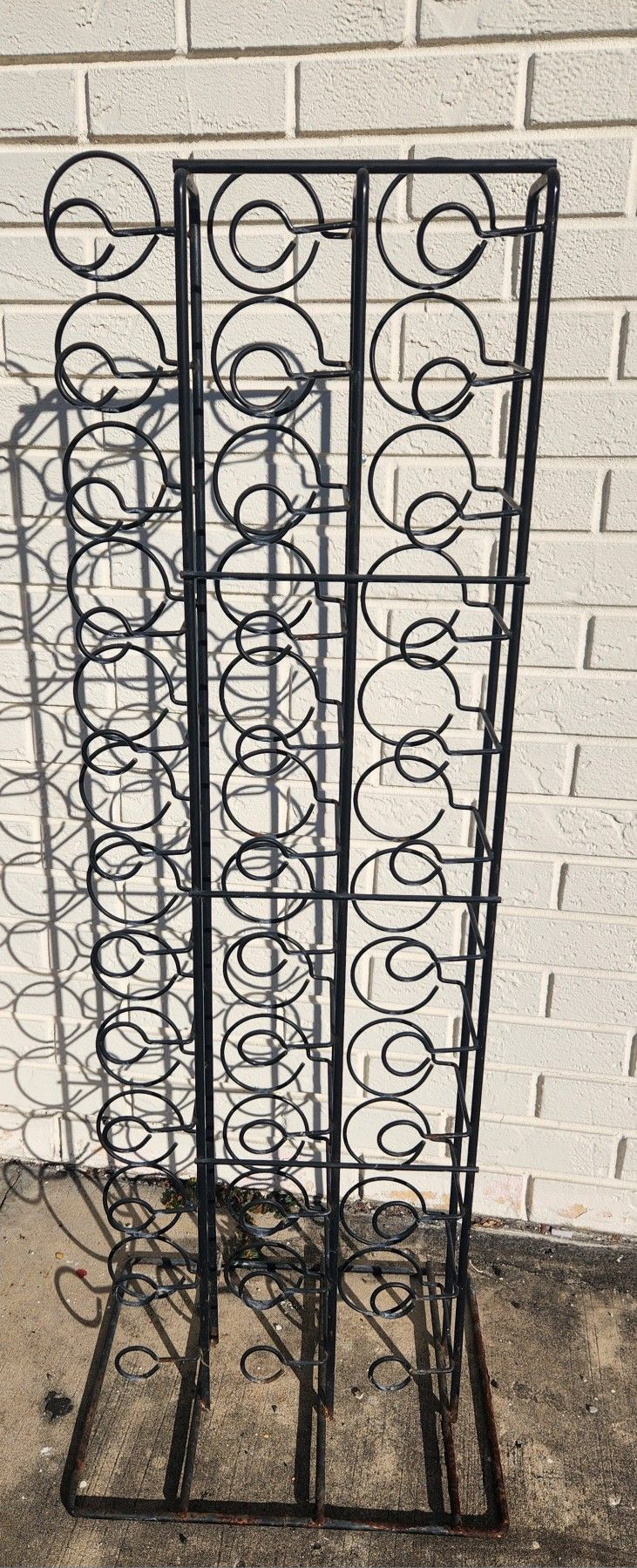 Rare Vintage Unique Wrought Iron Floor Standing Wine Rack 36 Bottles One of a Kind. The rack base measures approximately 18 1/4" × 15 1/4" and 49 1/2" high. The base has a bit of rust easily touched up.